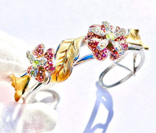 Gold Plated Rhodolite Garnet and Peridot Flowers and Gold Plated Leaves Bangle