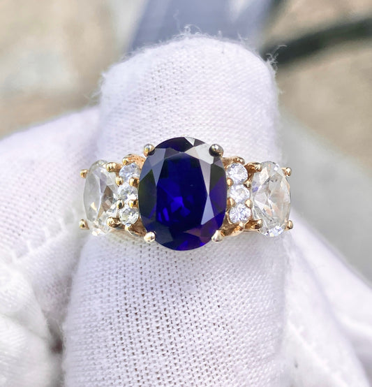 Gold Plated Oval Cut Synthetic Sapphire with “Diamond” Accents Ring