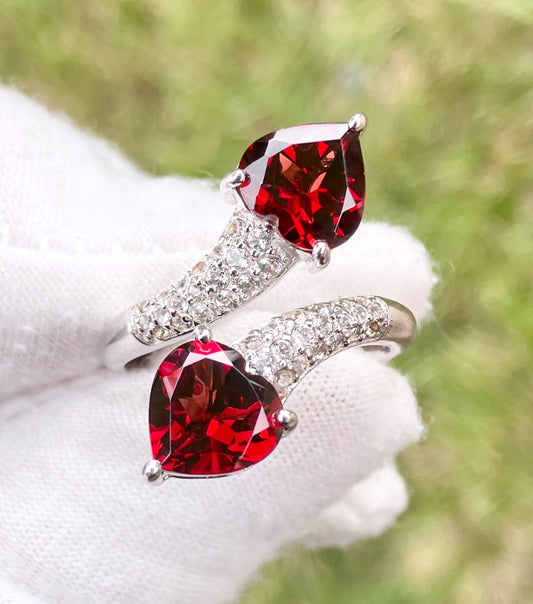 Heart Garnets in “Diamonds” Studded Split Bypass Shank Ring