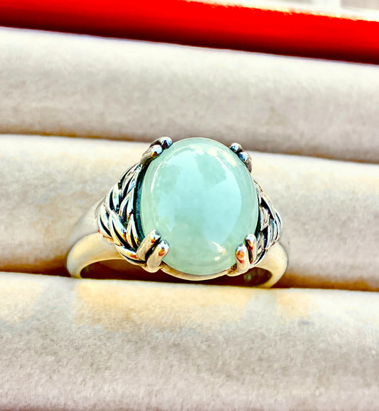 Anillo Cabujón de Jade Verde Suave con Grabados de Hojas