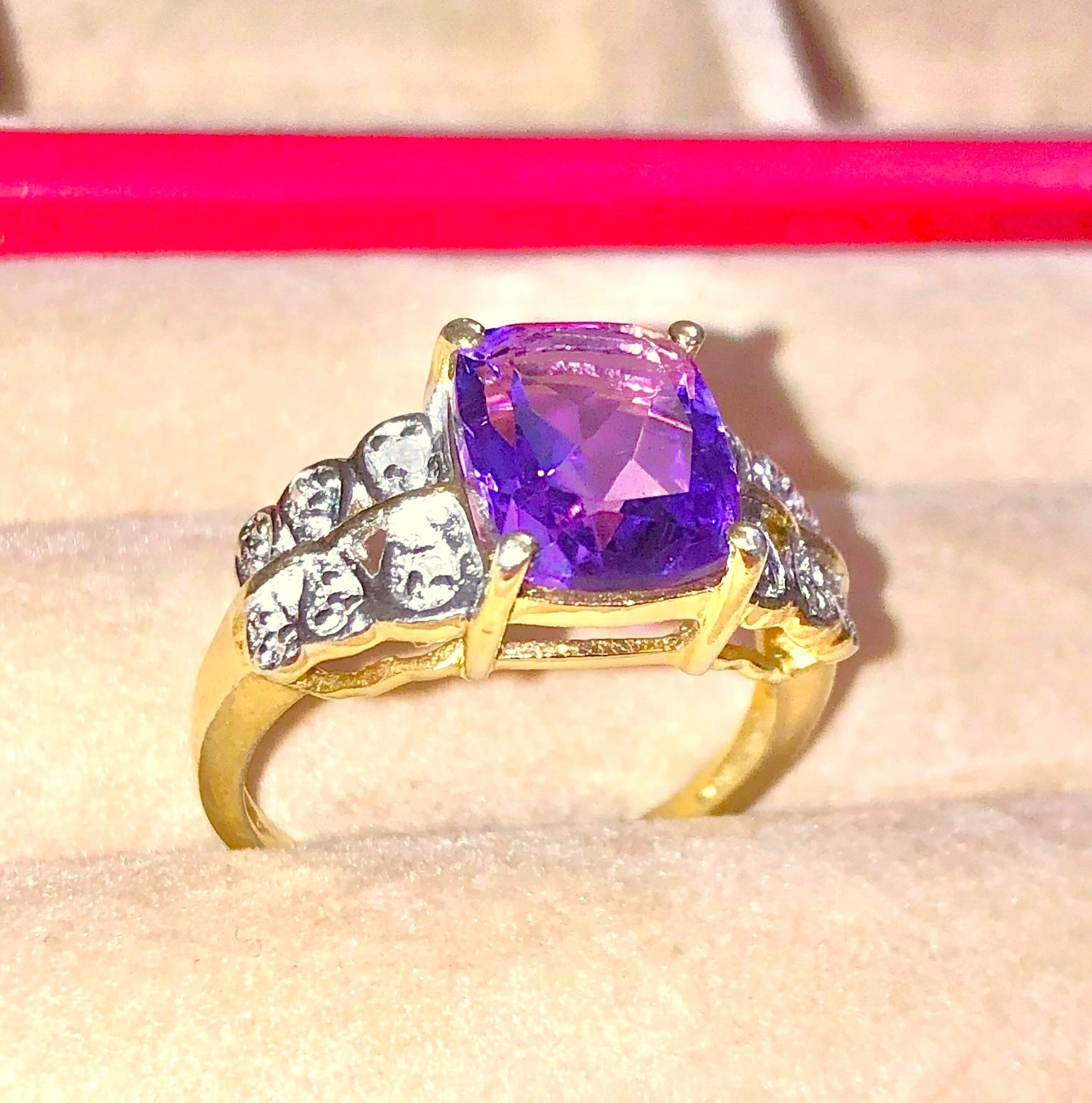 Anillo alargado de amatista de talla cojín chapado en oro con detalles de diamantes