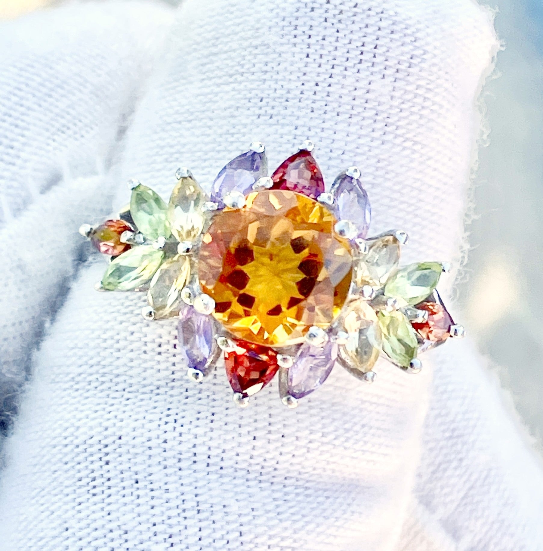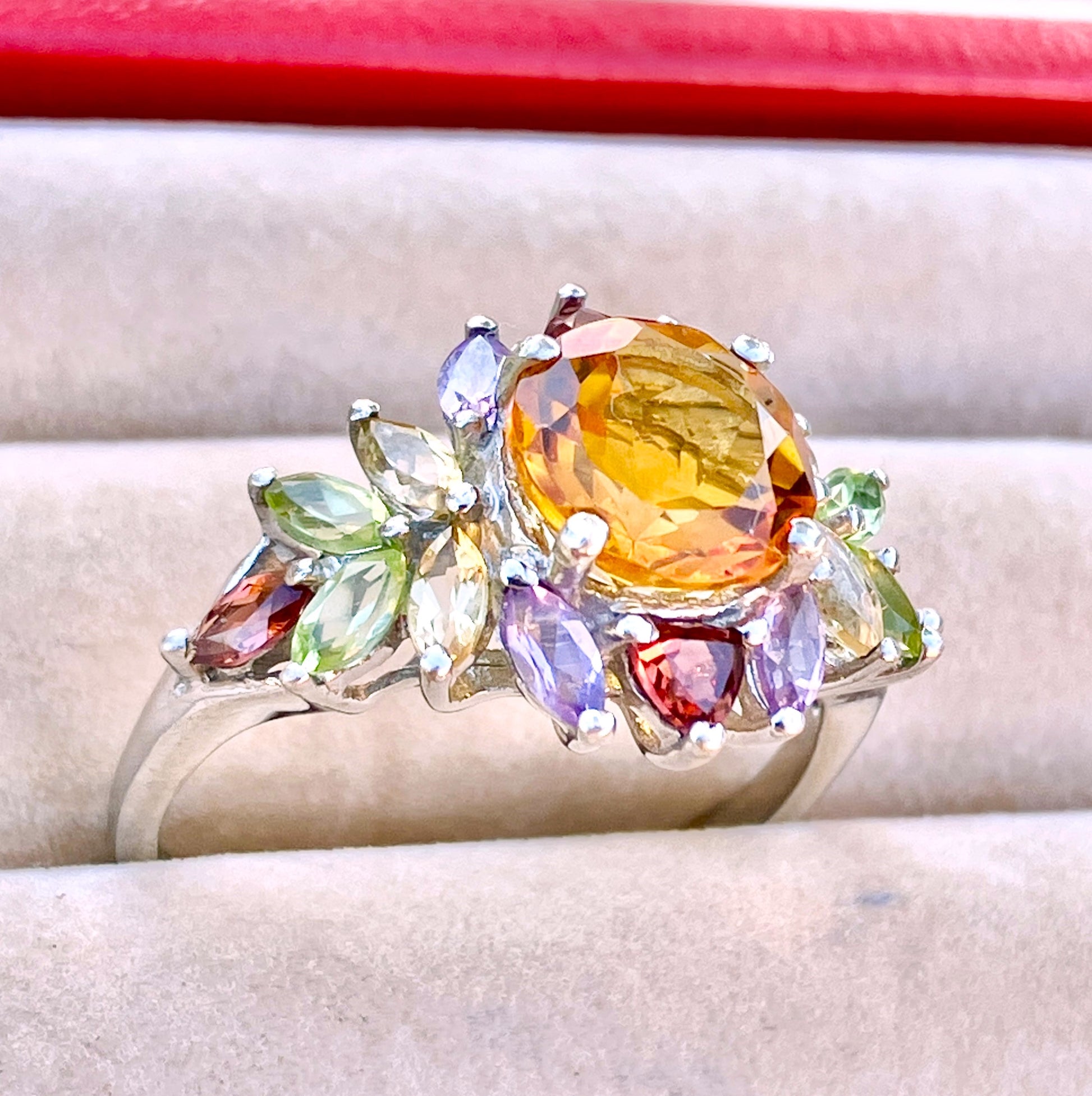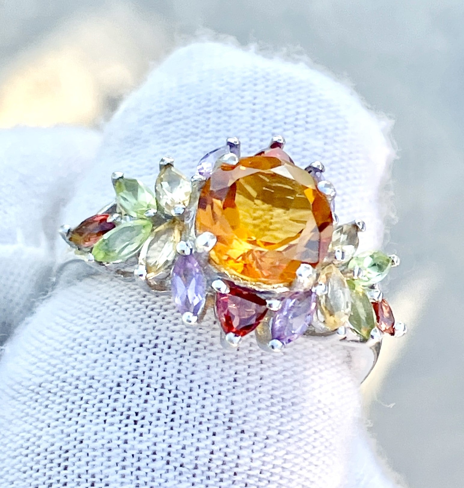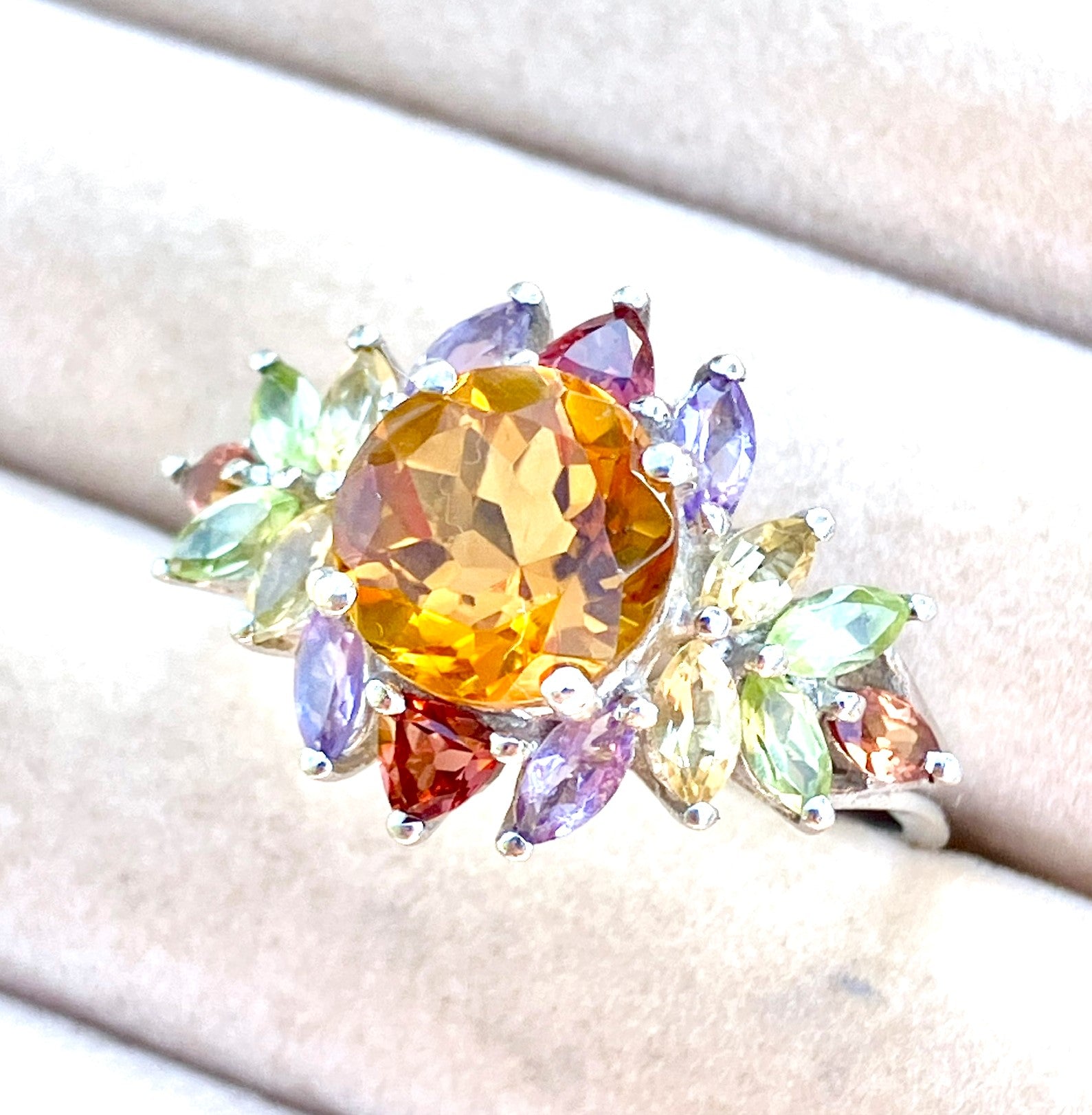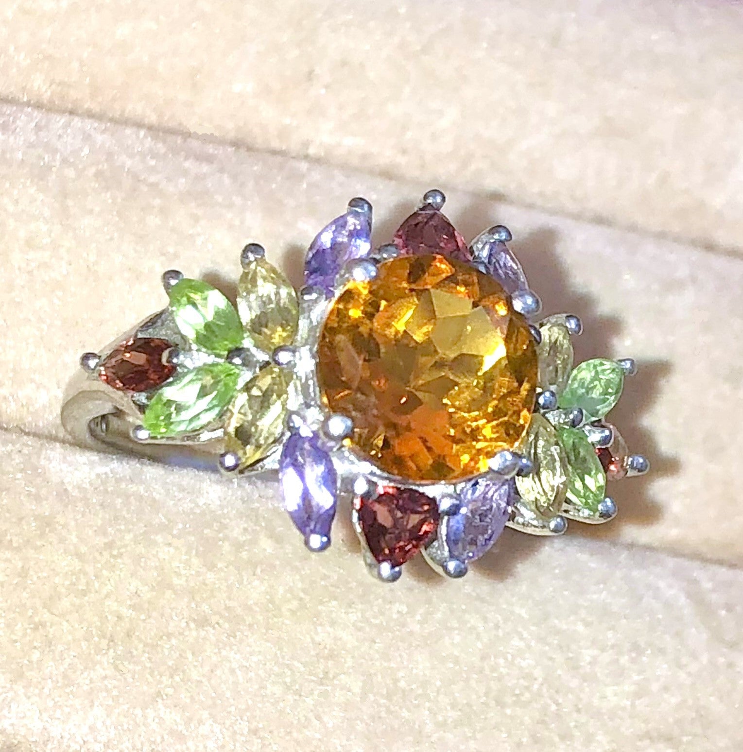 Piedra central de citrino en anillo de corona de citrino, peridoto, amatista y granate