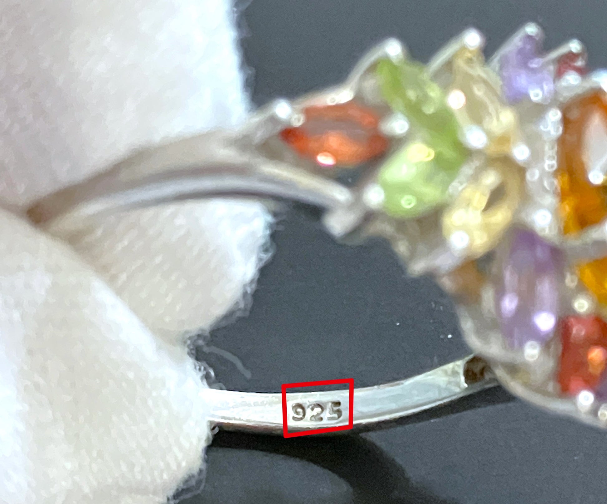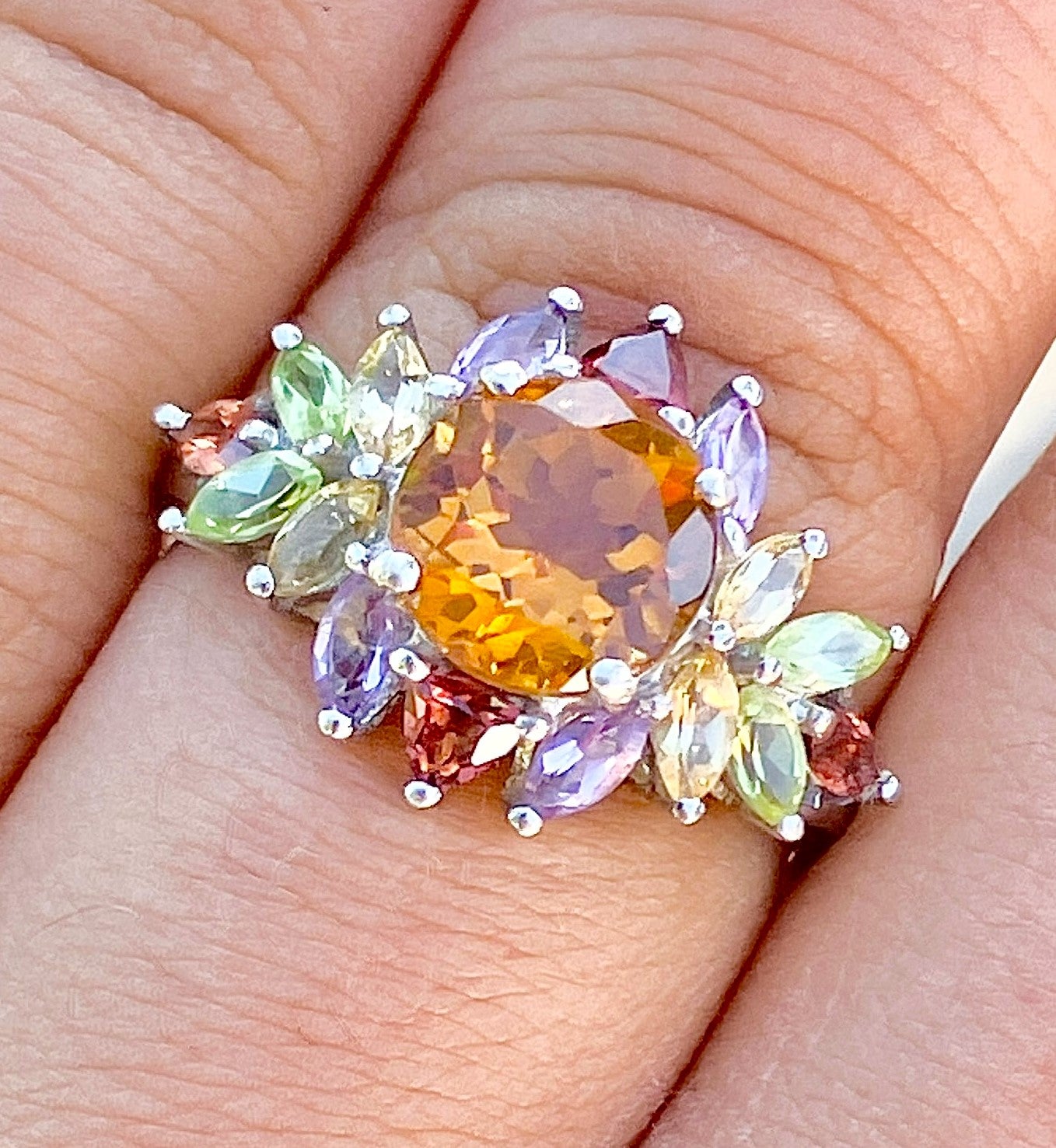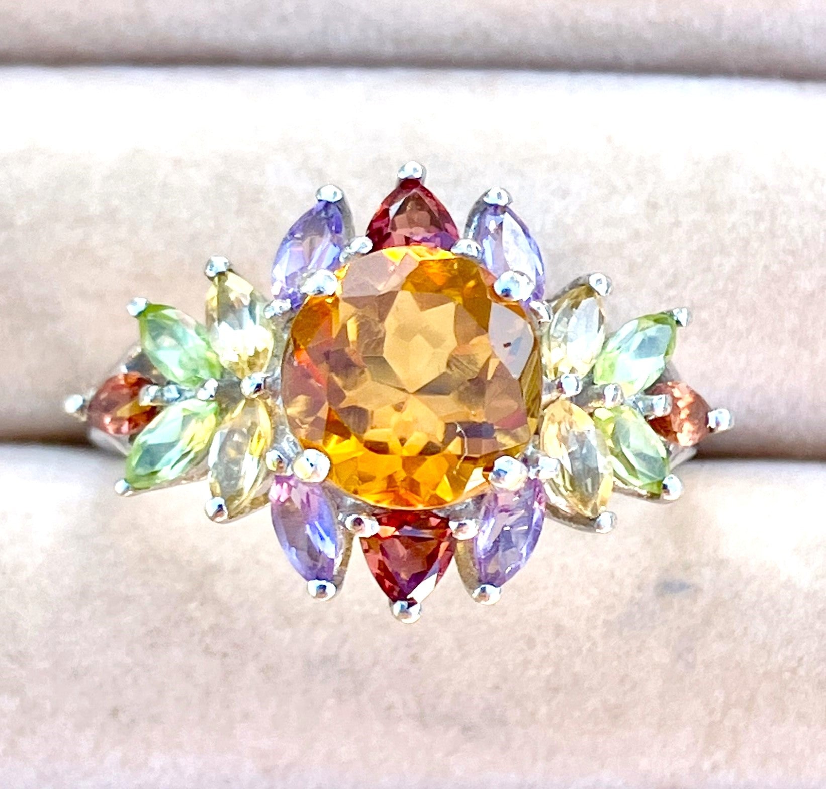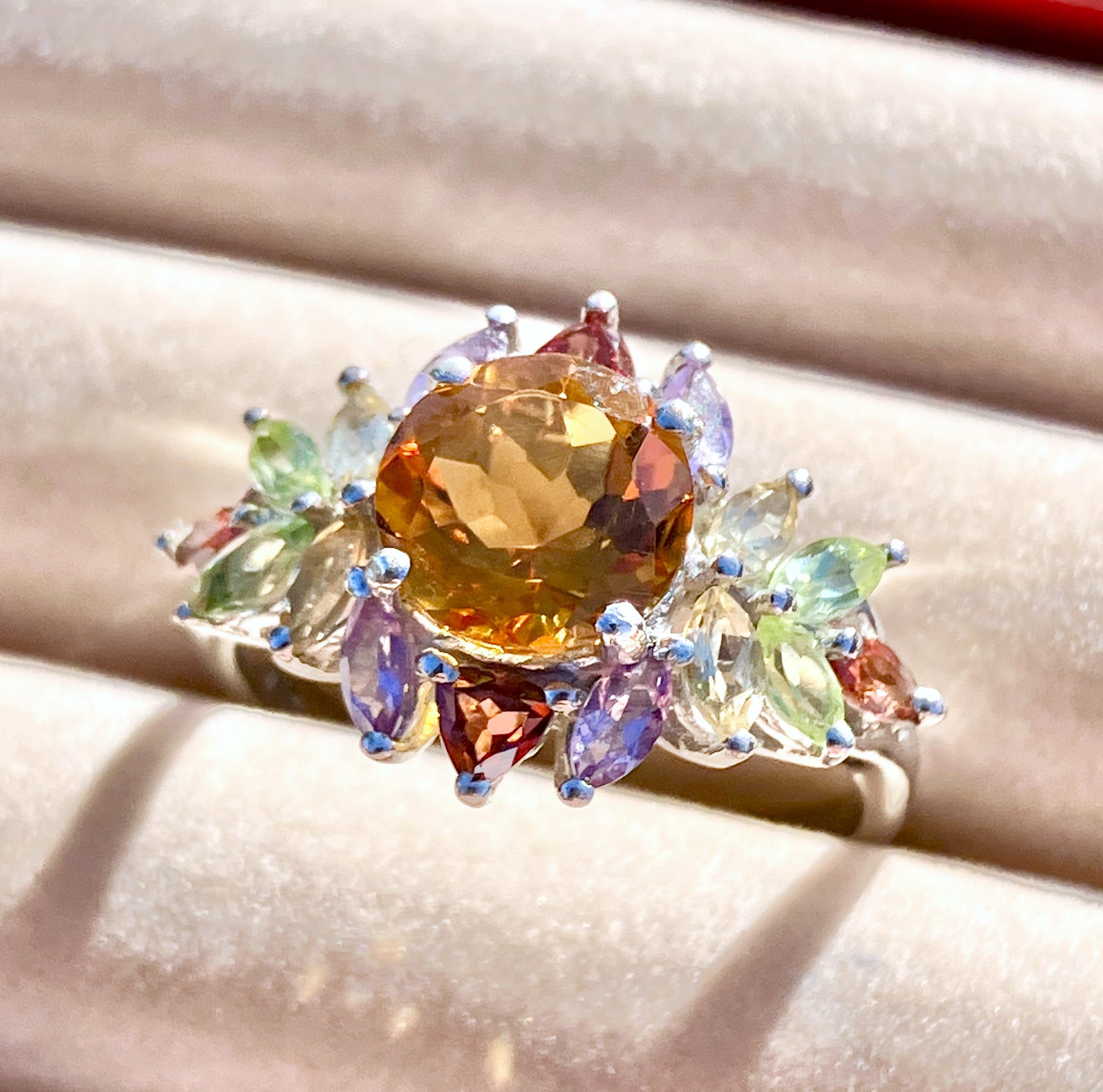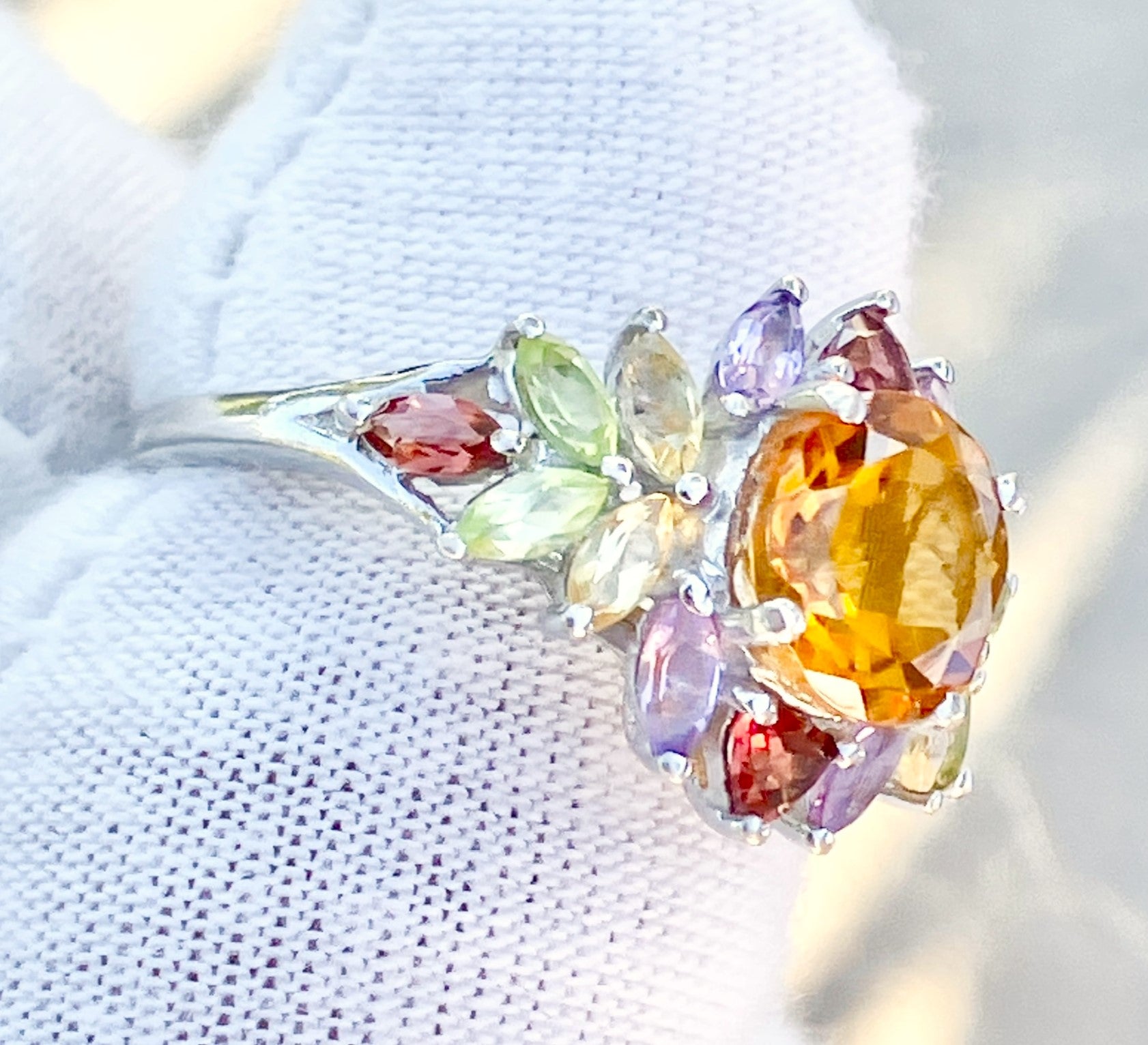 Piedra central de citrino en anillo de corona de citrino, peridoto, amatista y granate