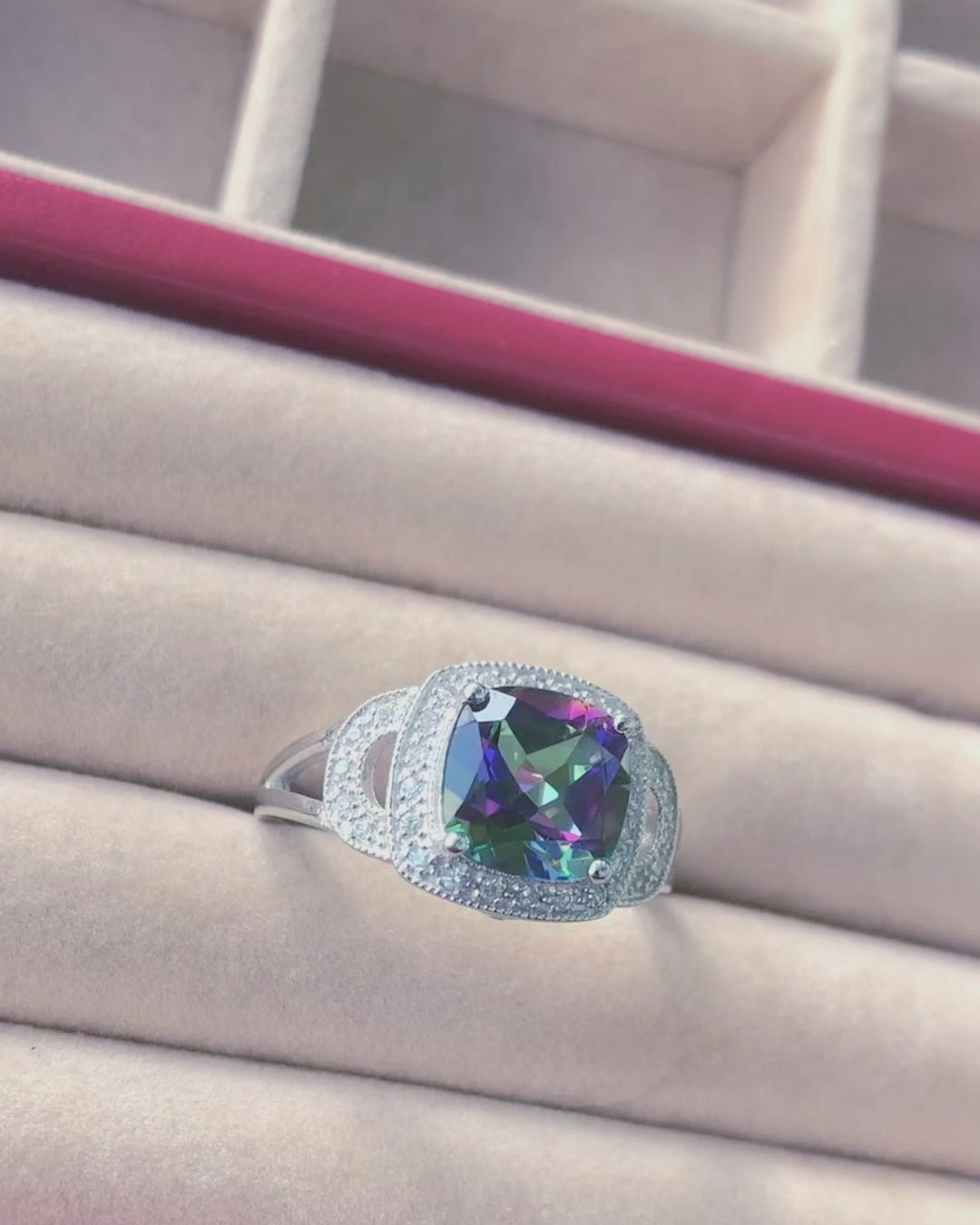 - Cushion Cut Mystic Topaz Centerstone; 9x9mm, ~3.5ctw