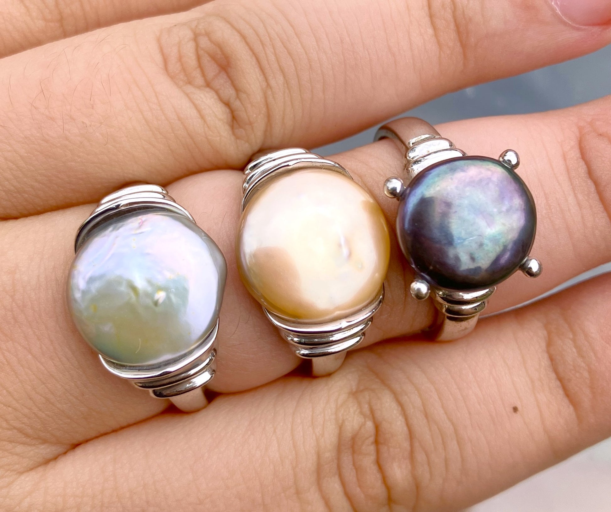 - Prong Set Peacock Tahitian Colored Pearl Ring - Size 10.25 (Coin Pearl - 12.8mm)