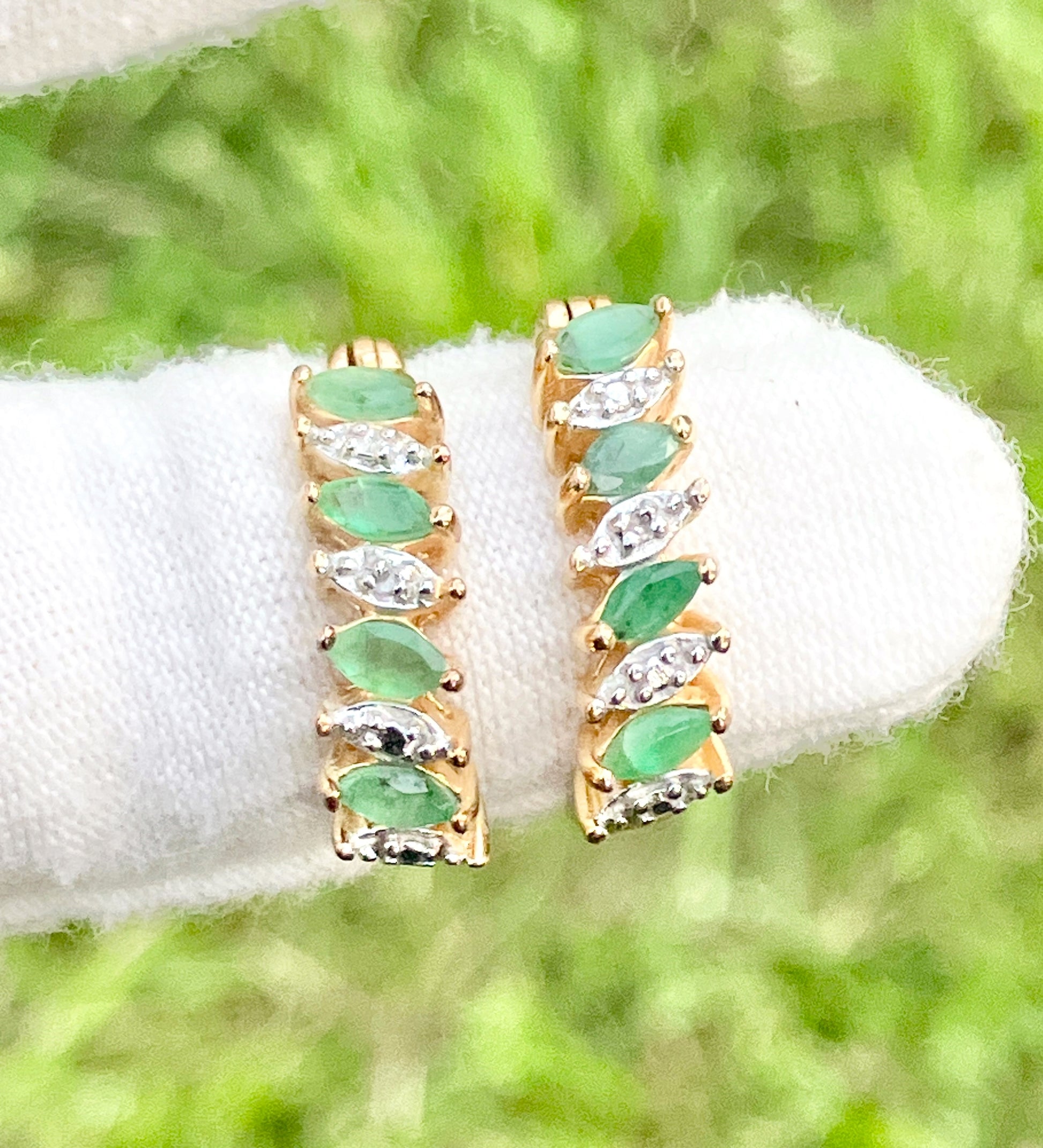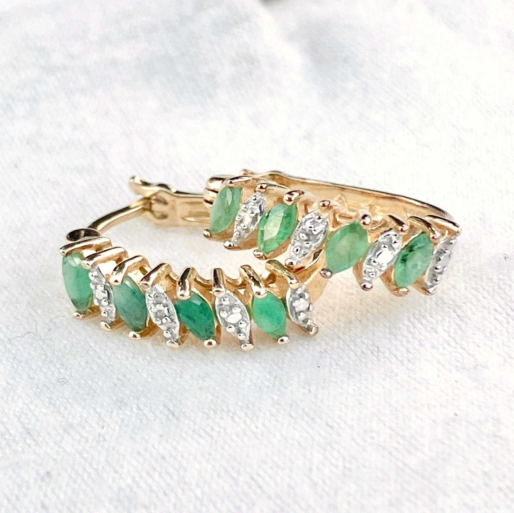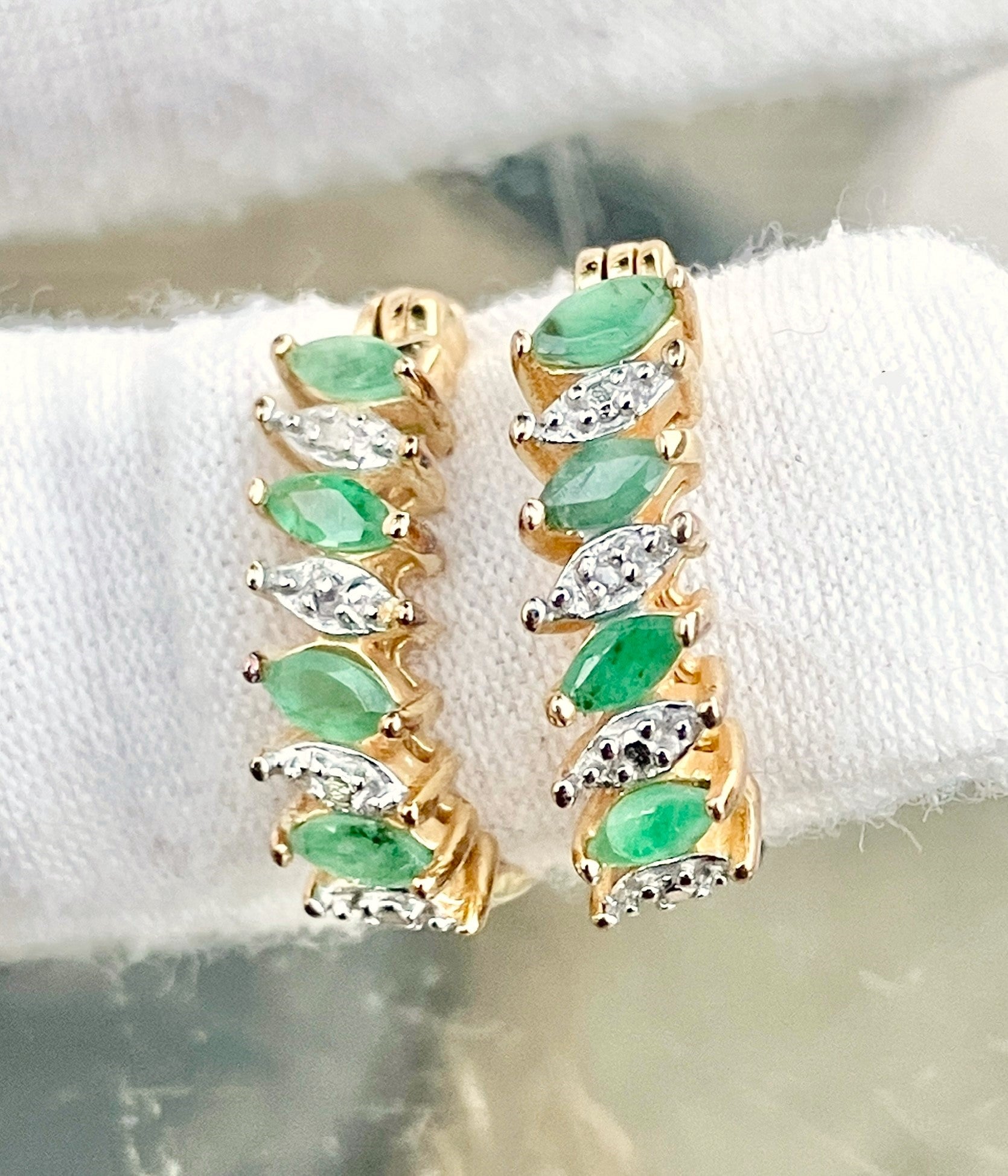 - Hinged Hoop Earrings: 19x4.85mm - Marquise Cut Emeralds; 4x2mm, ~0.08cts each, ~0.64ctw & Diamonds; 1mm, 0.005cts each, 0.01ctw