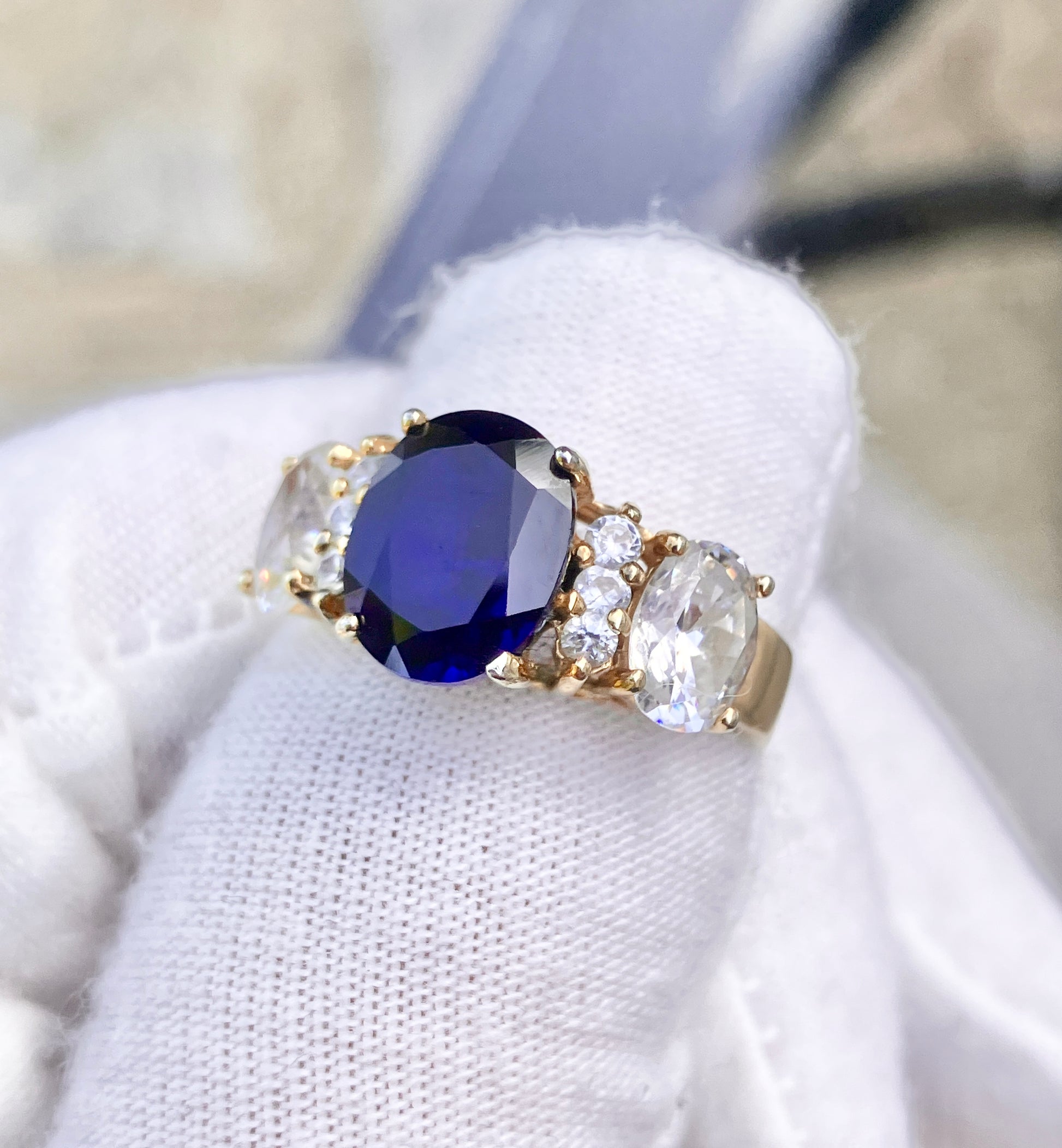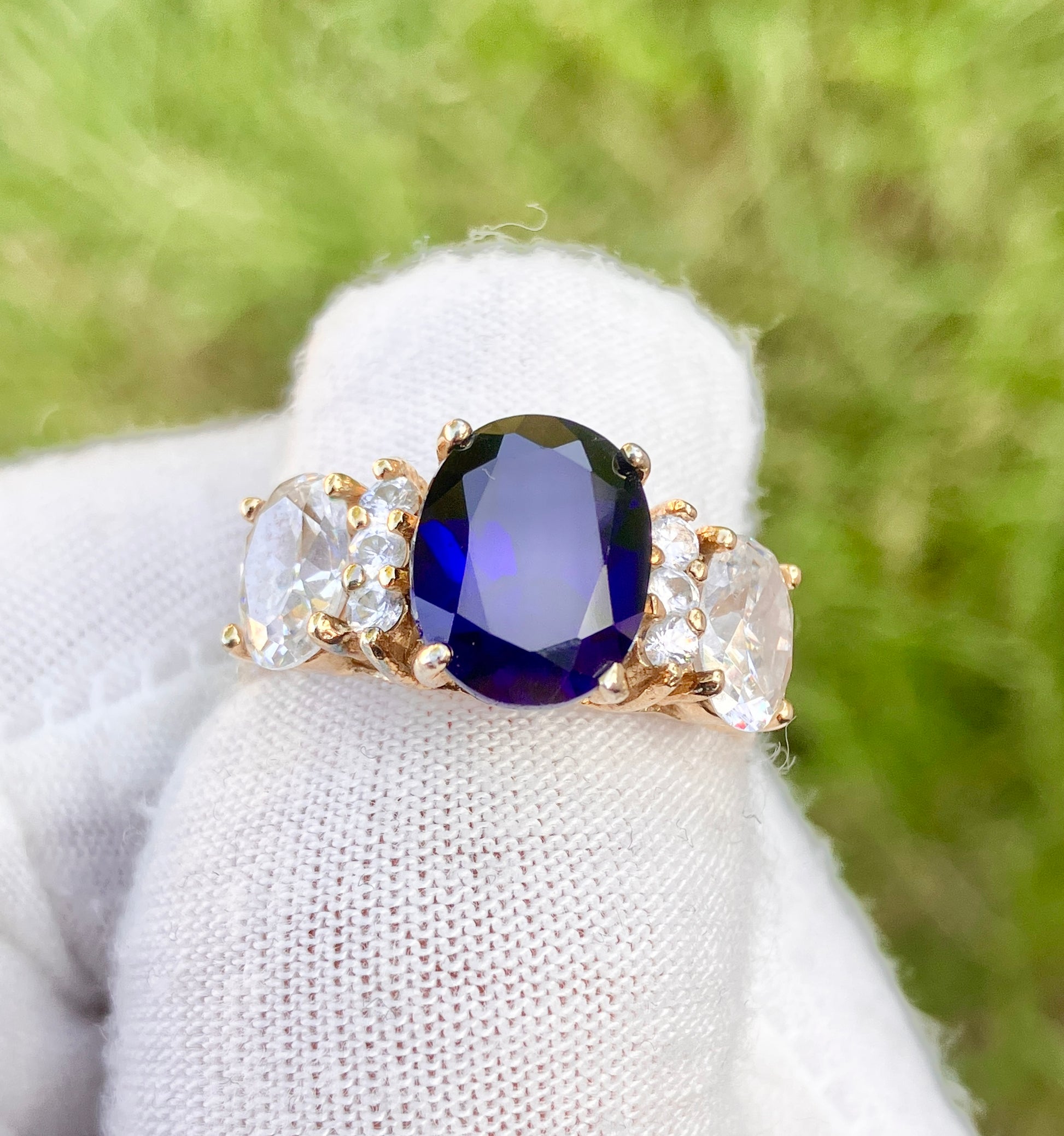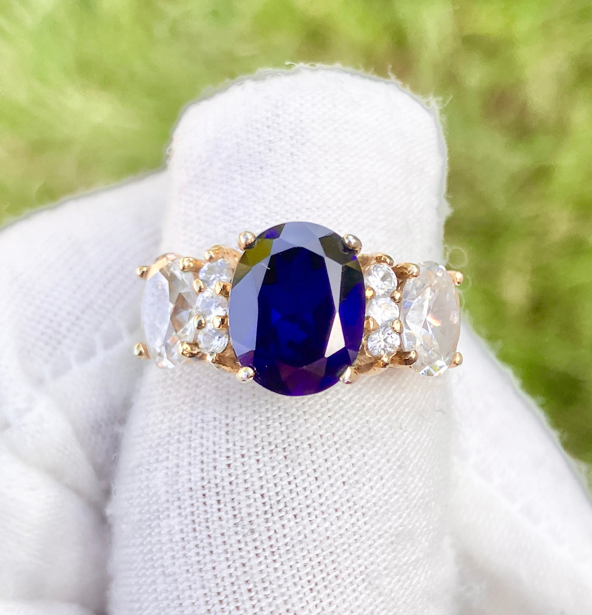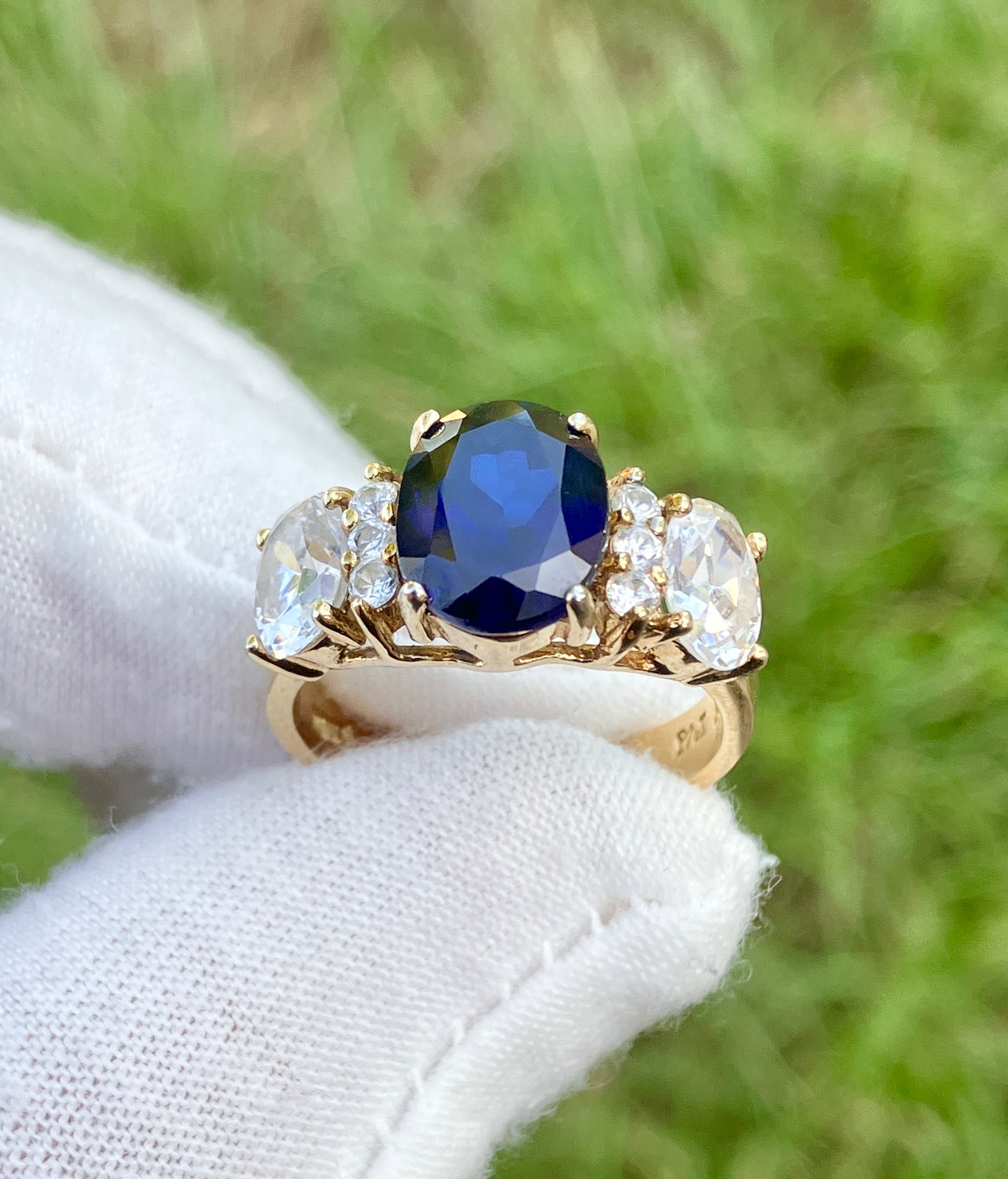 Gold Plated Oval Cut Synthetic Sapphire with “Diamond” Accents Ring
