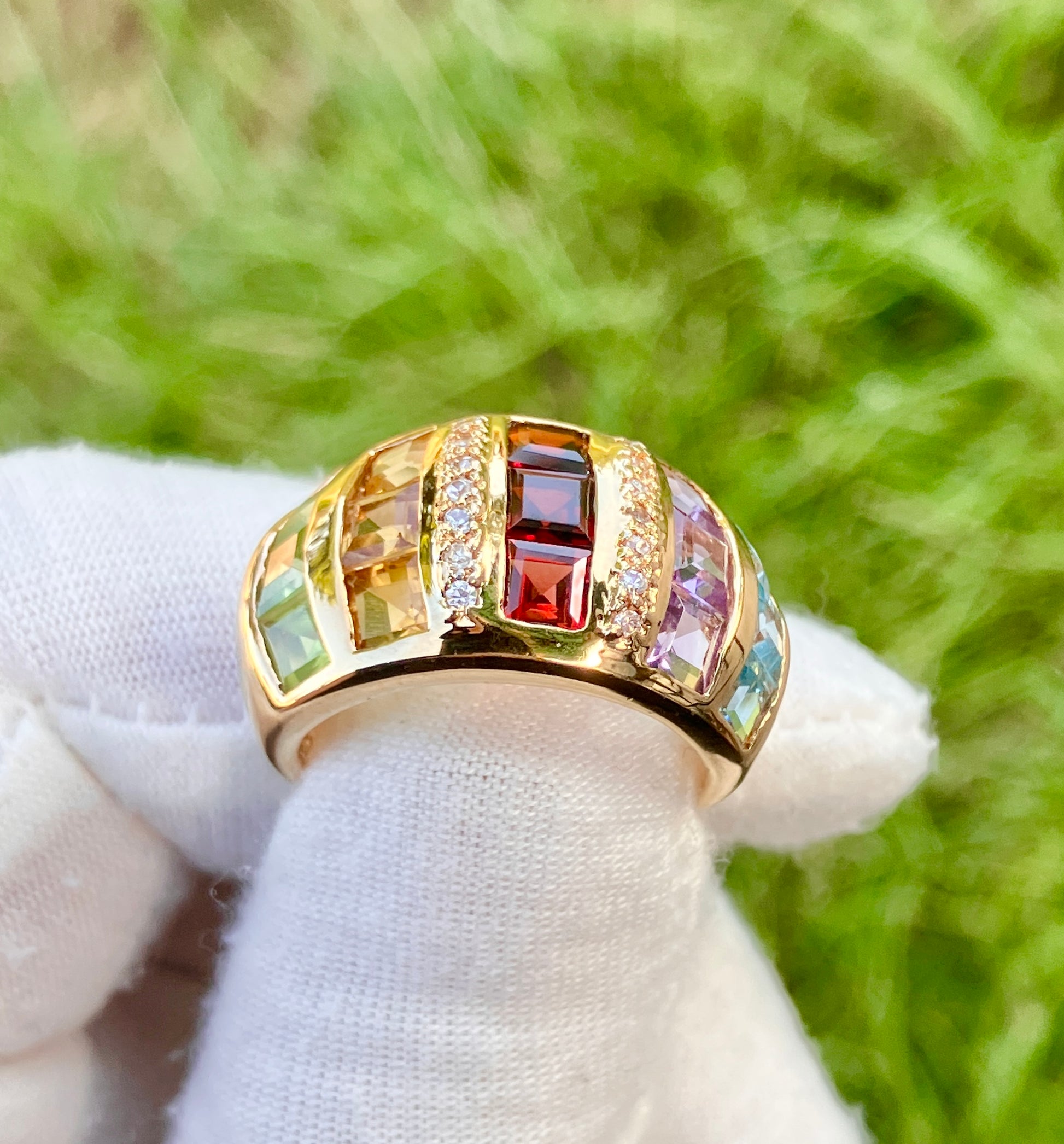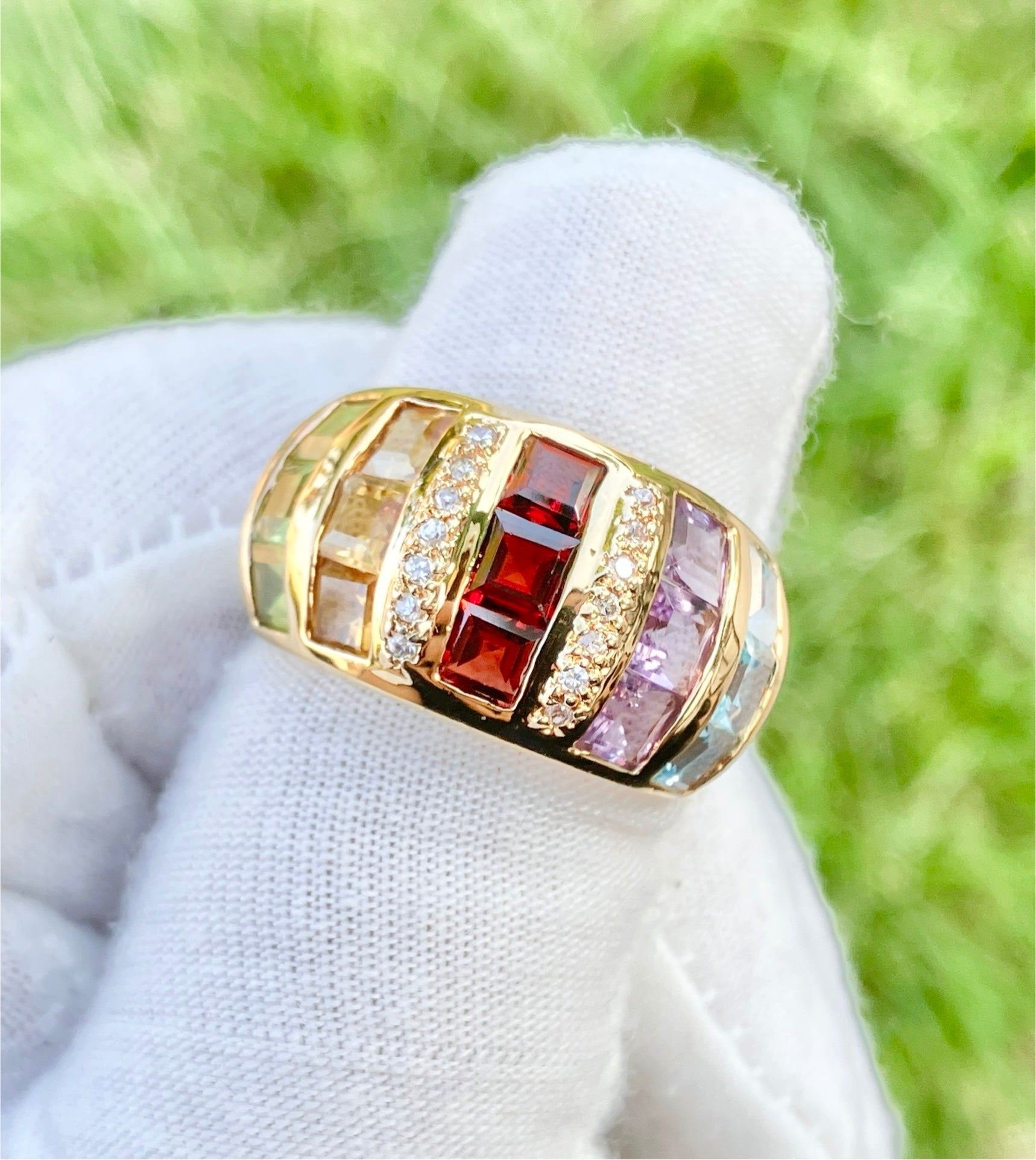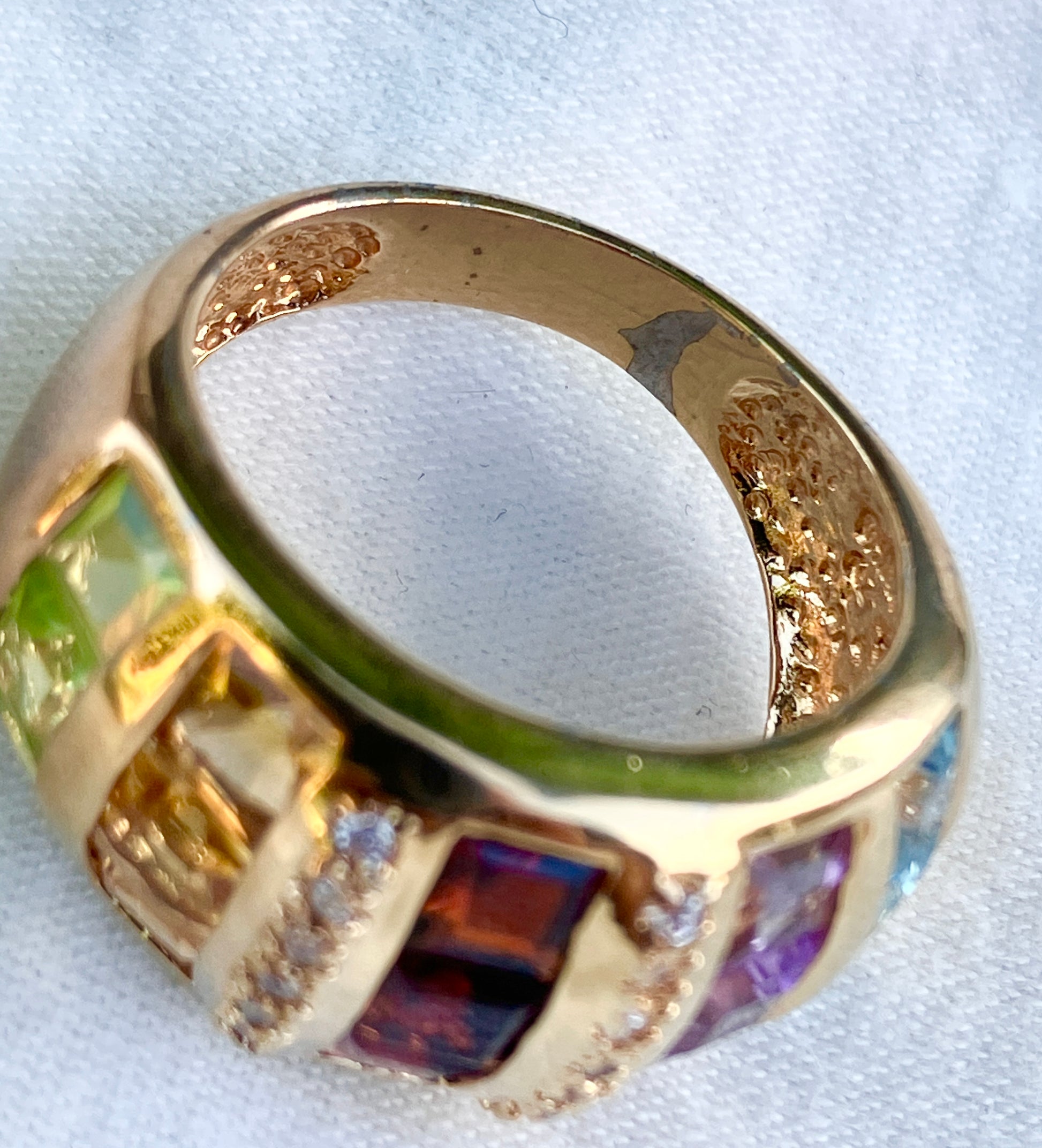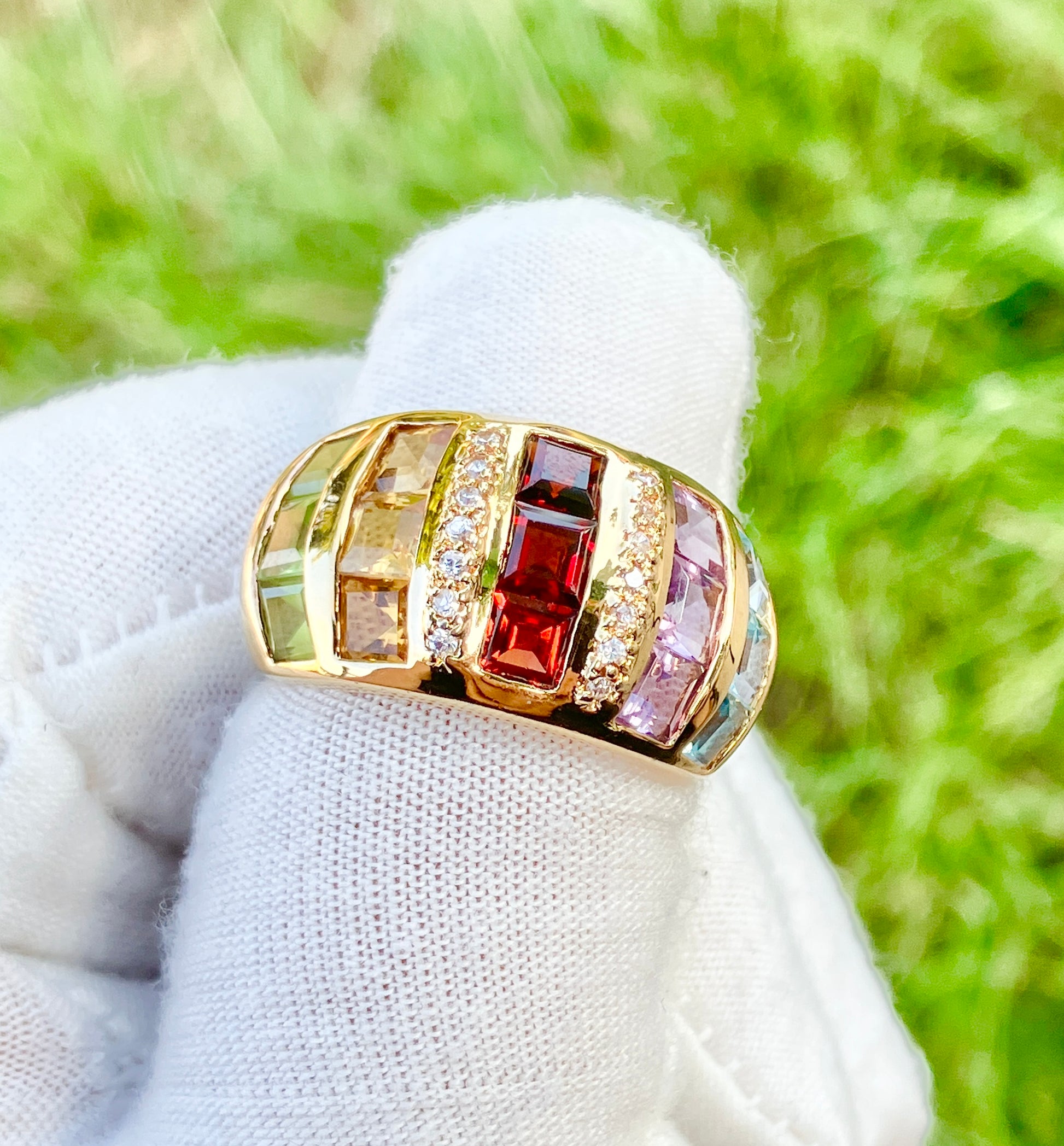 Gold Plated Square Step-cut Multi-Gemstone Ring with “Diamond” Accents