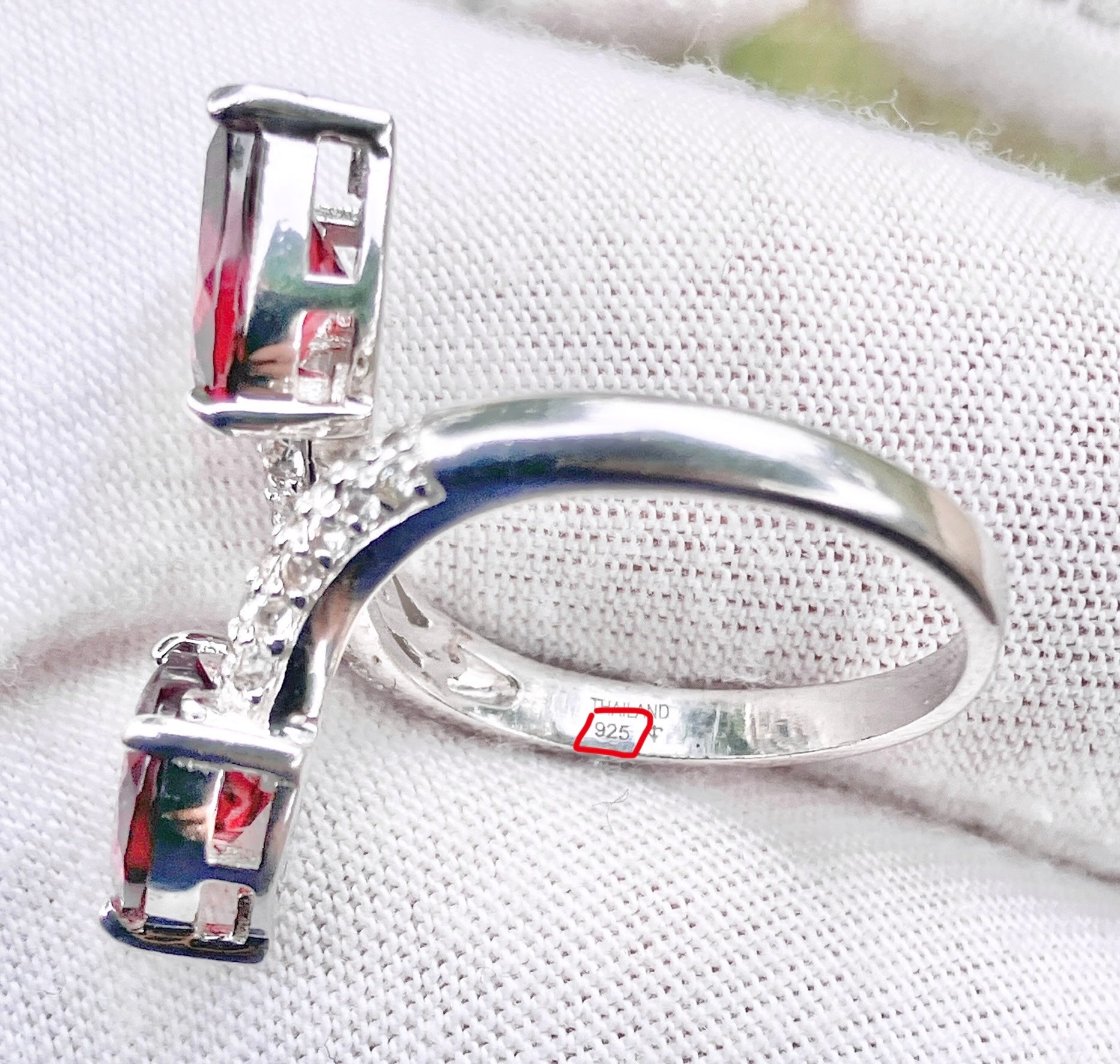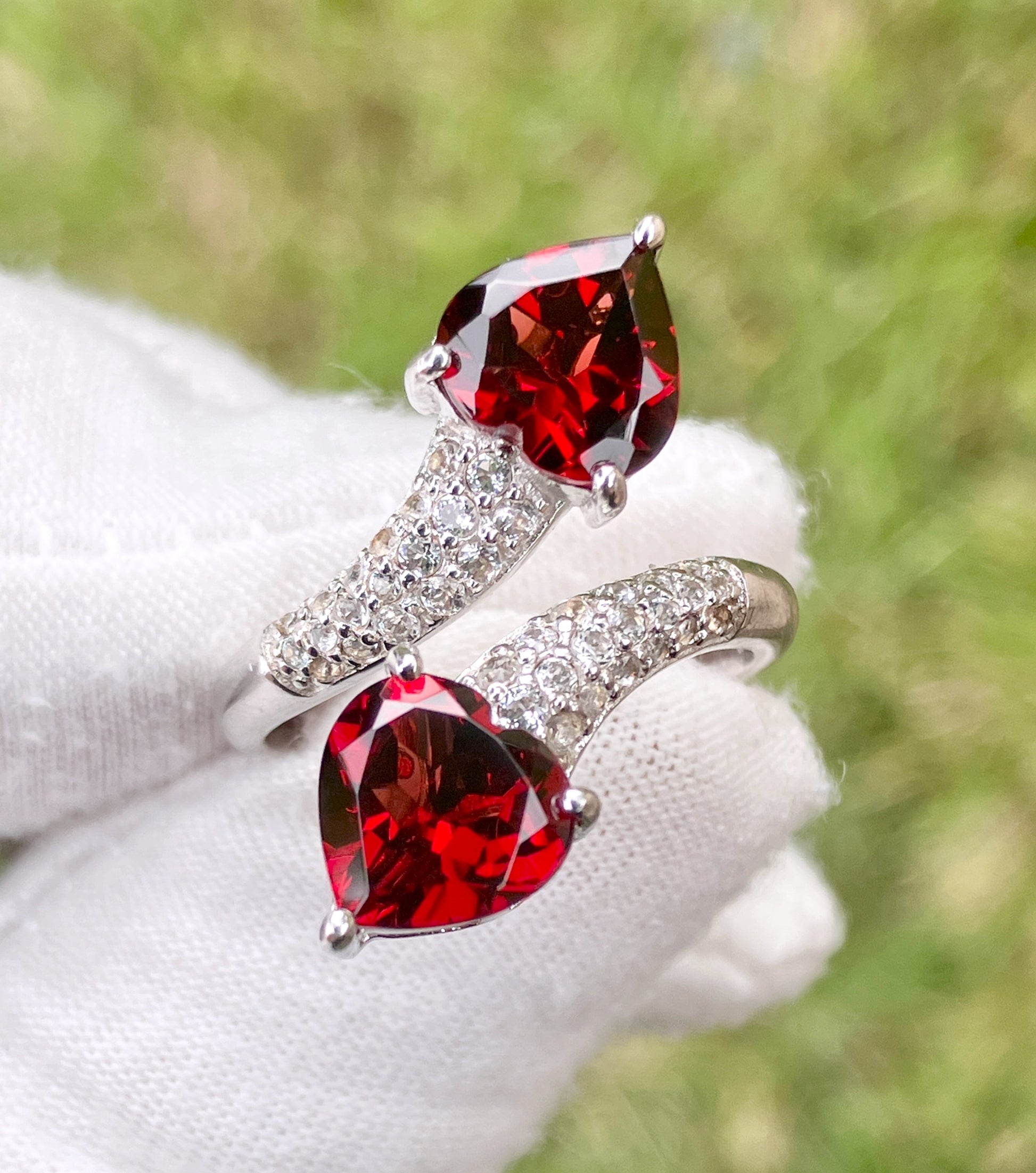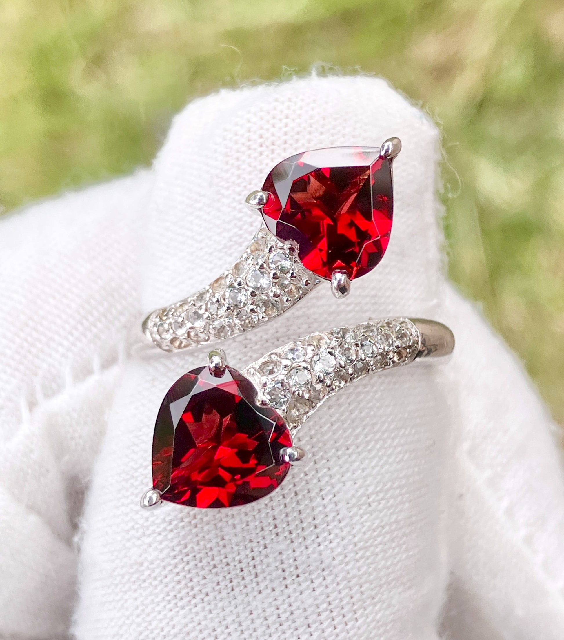 Heart Garnets in “Diamonds” Studded Split Bypass Shank Ring