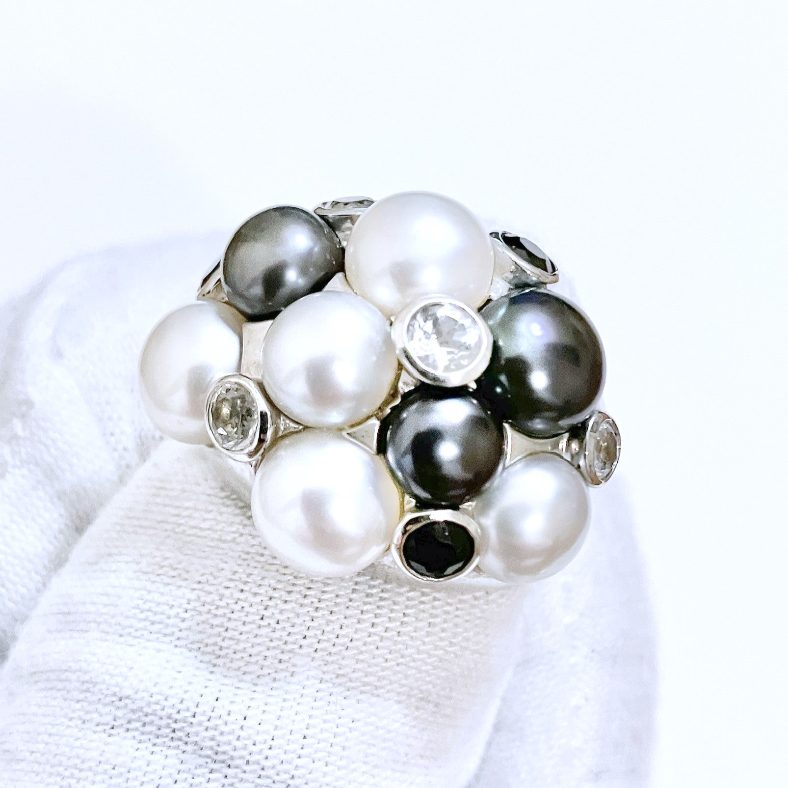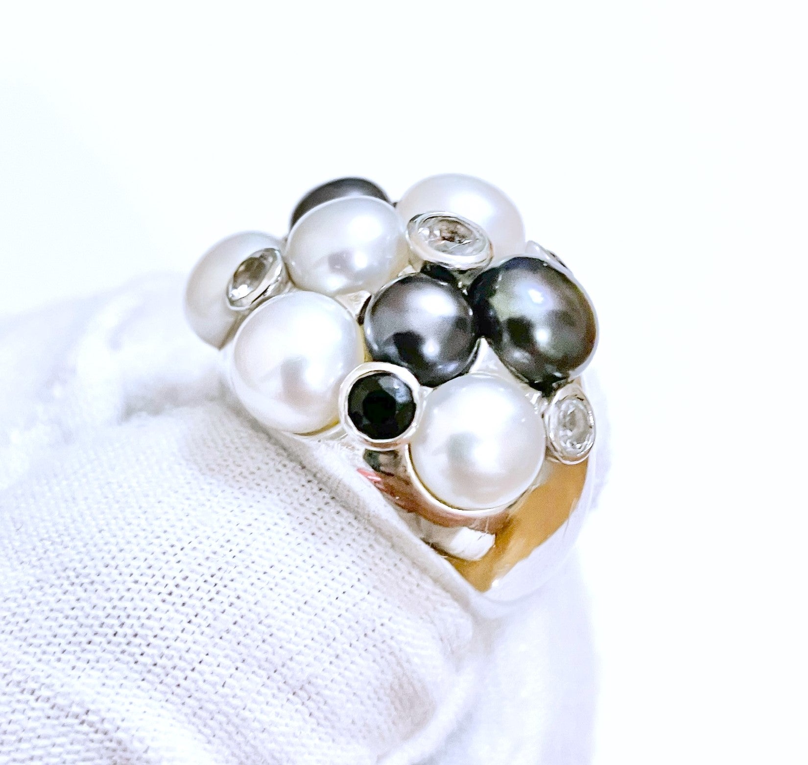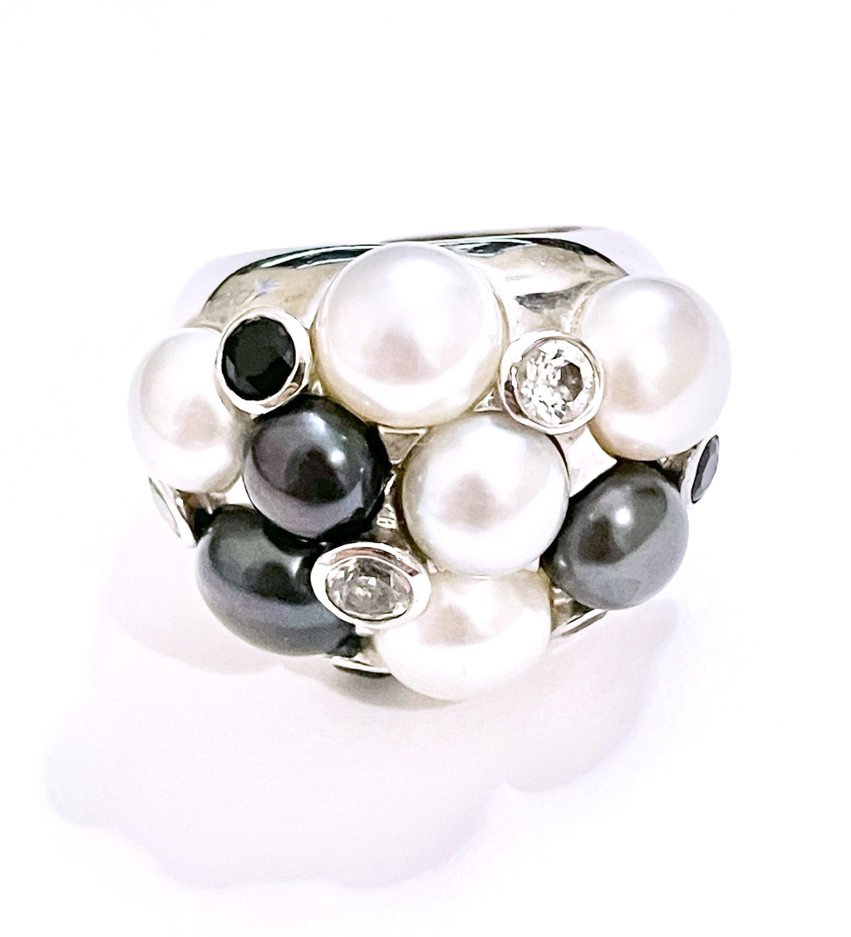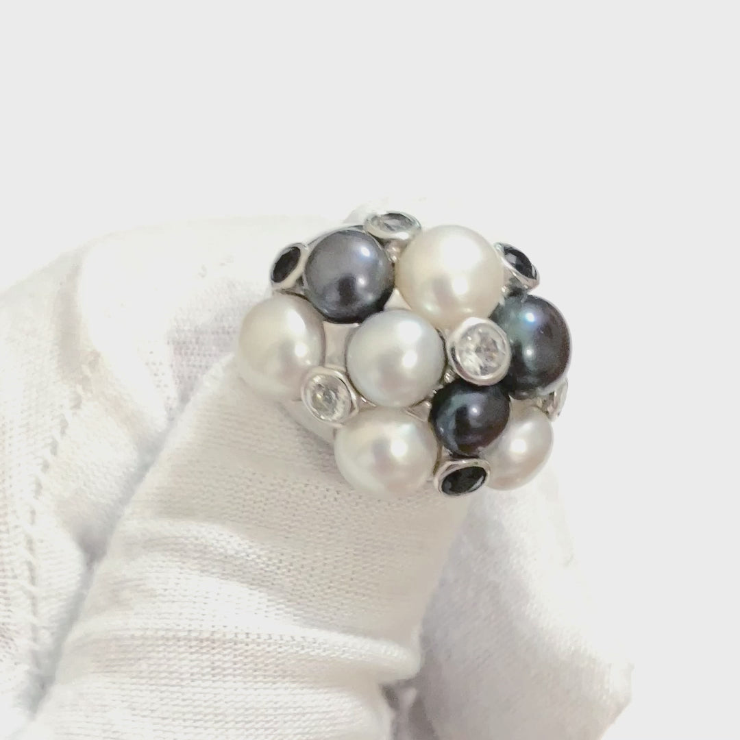 Cluster Tahitian & Silver Pearls with Black & Colorless Bezel Set "Diamonds" Ring
