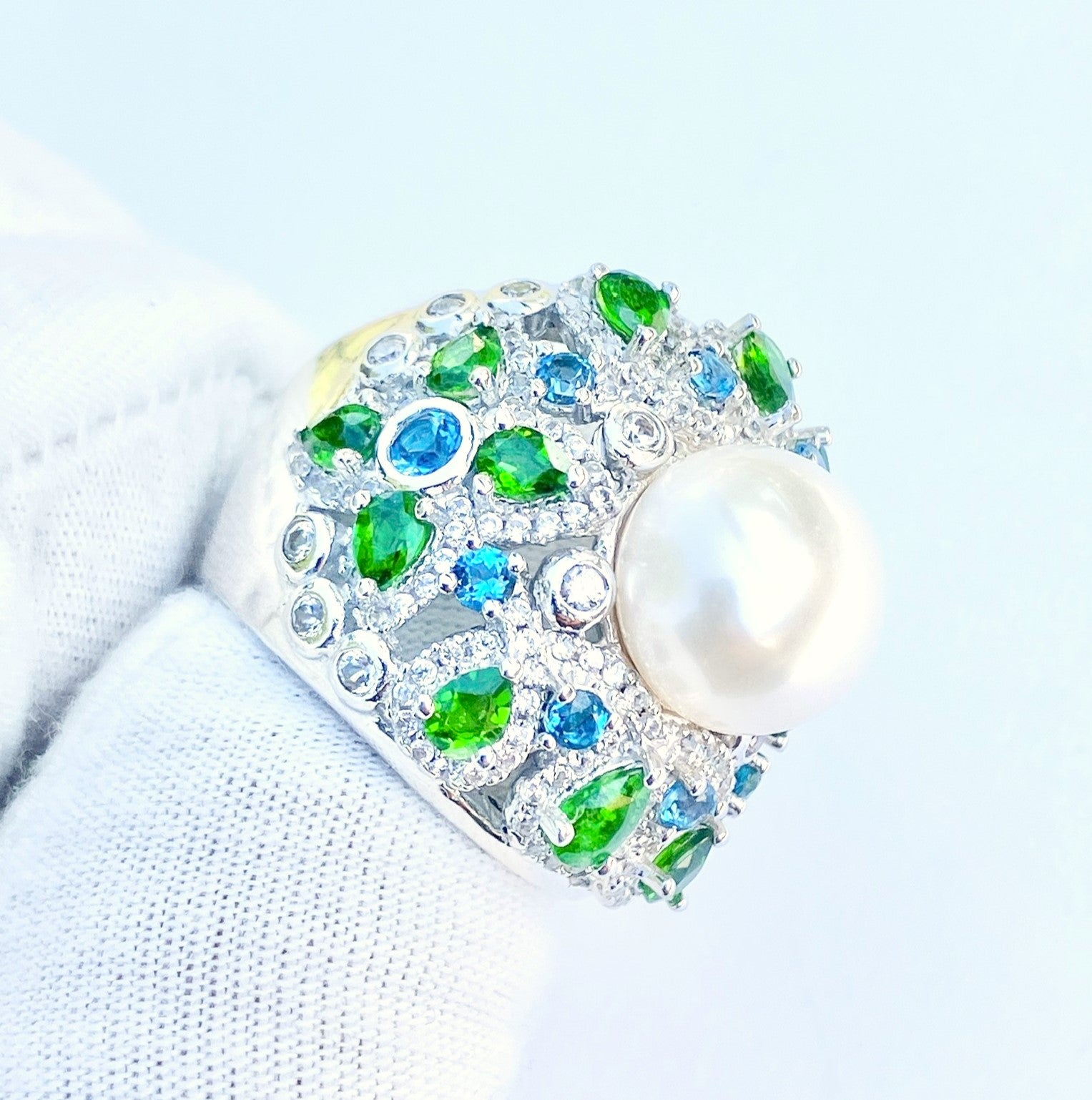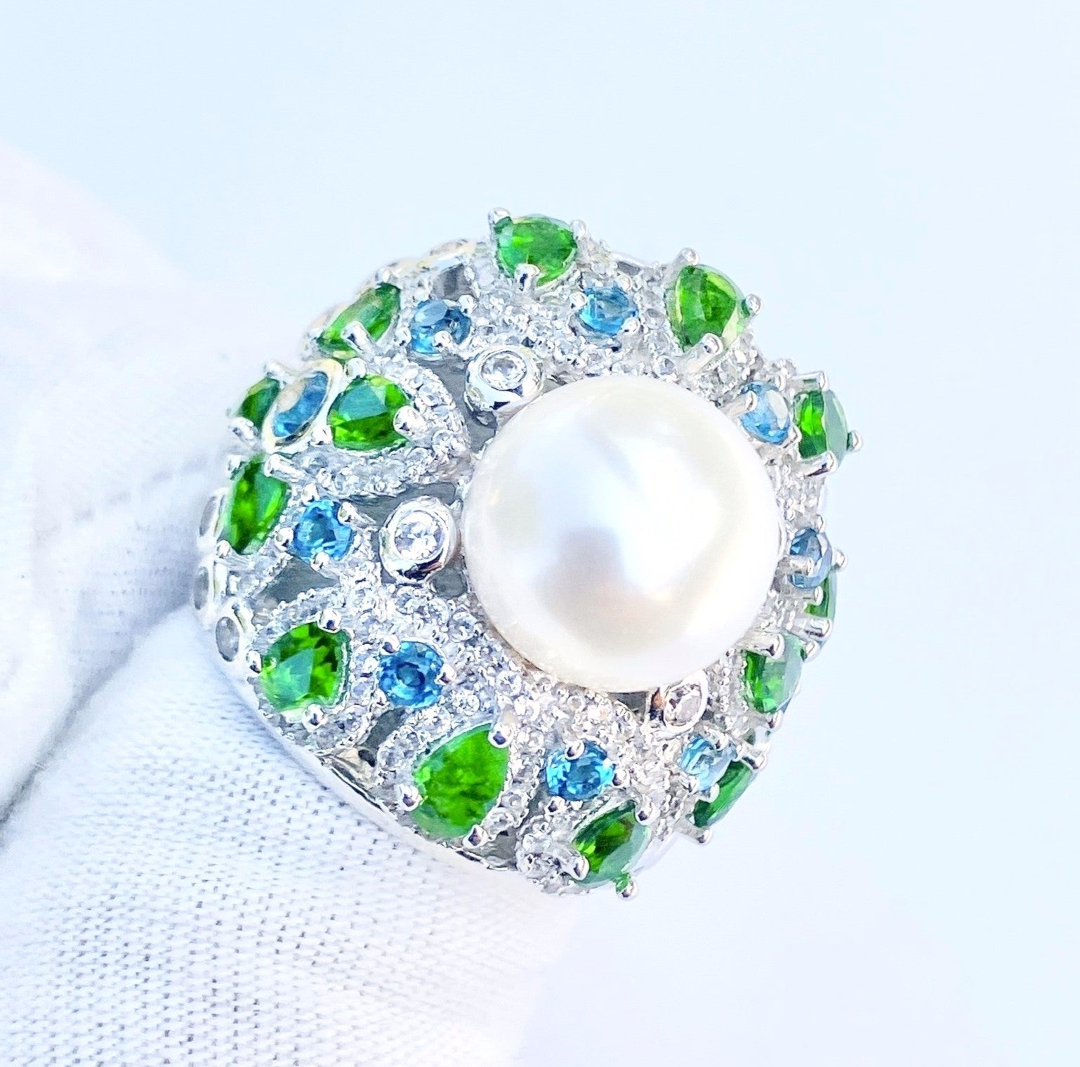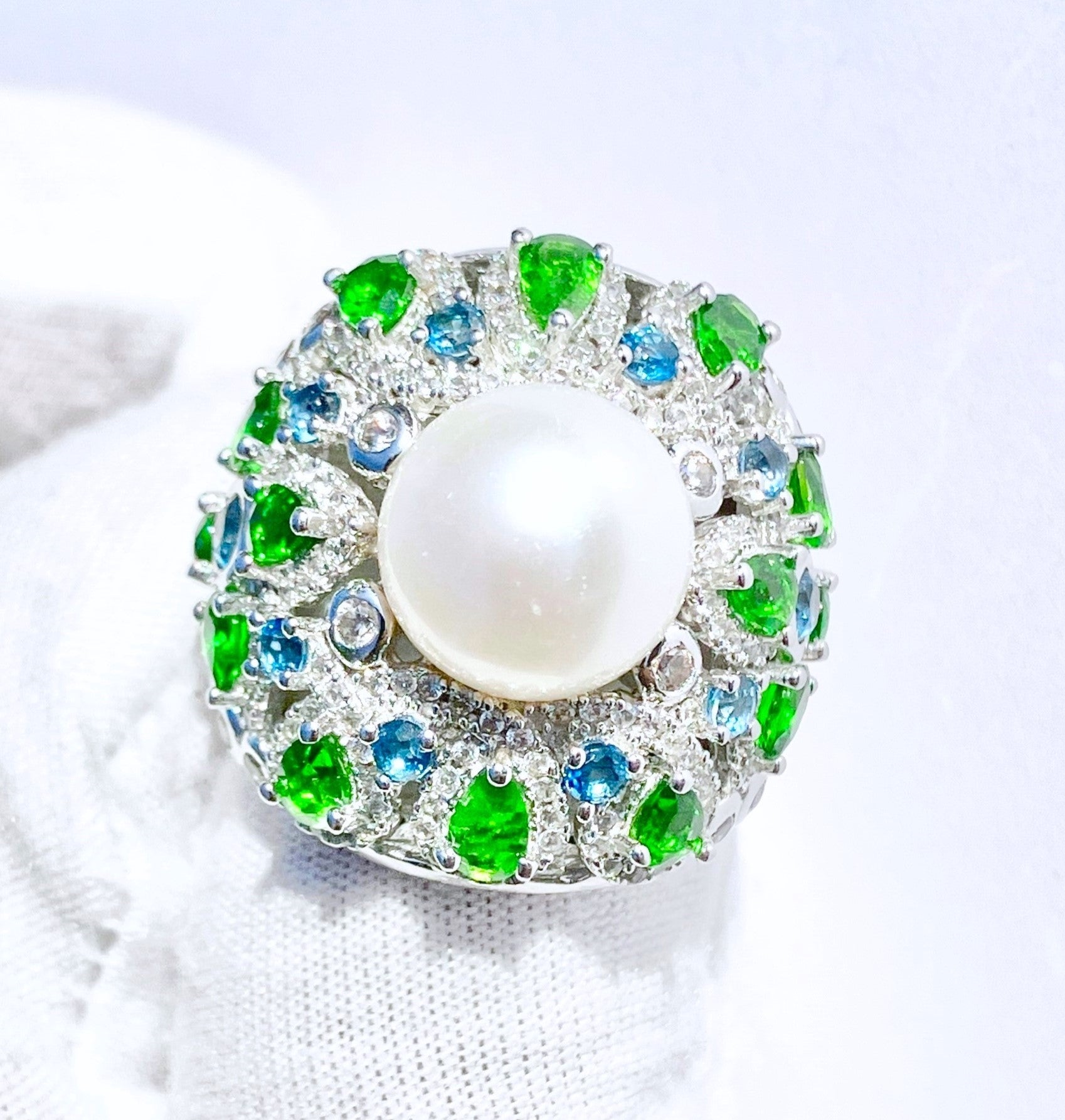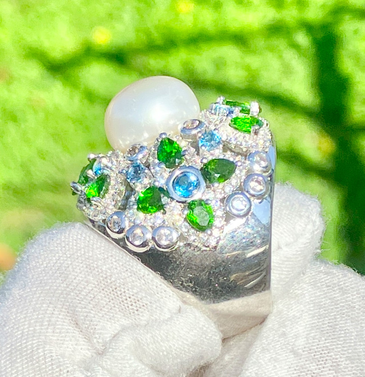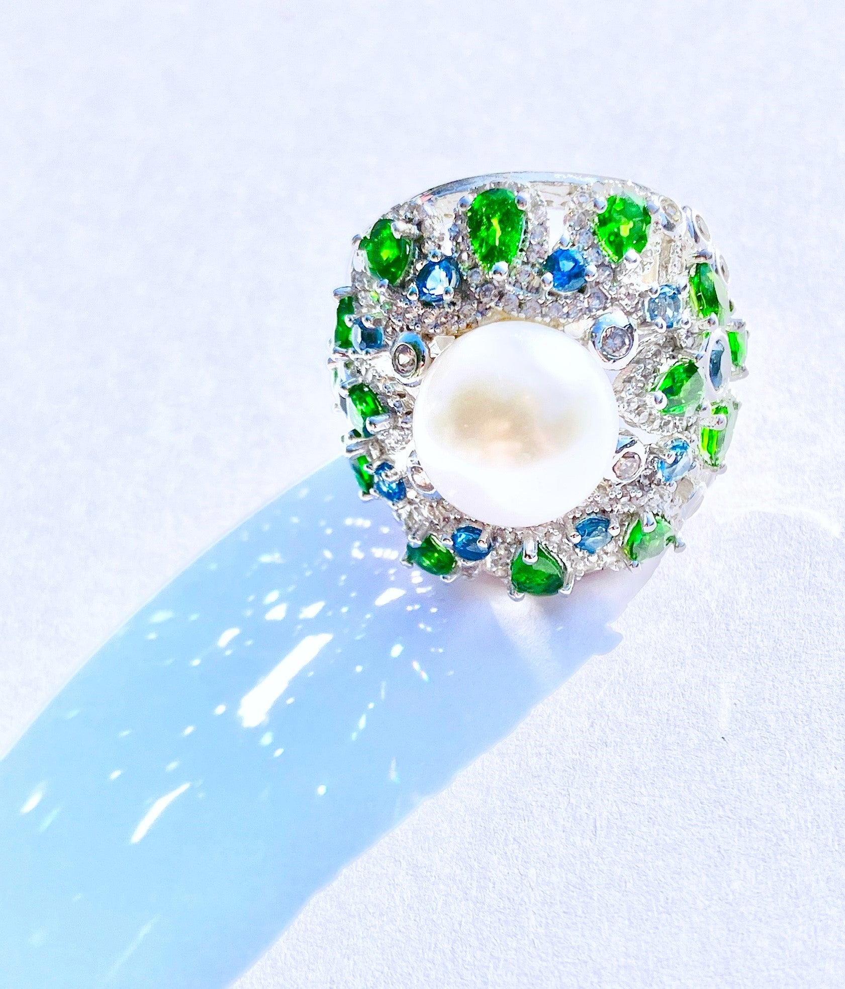Pearl in Crown Style Setting with Pear Cut Chrome Diopside, Round Cut Baby Swiss Blue Topaz, and Zircon Halos Ring