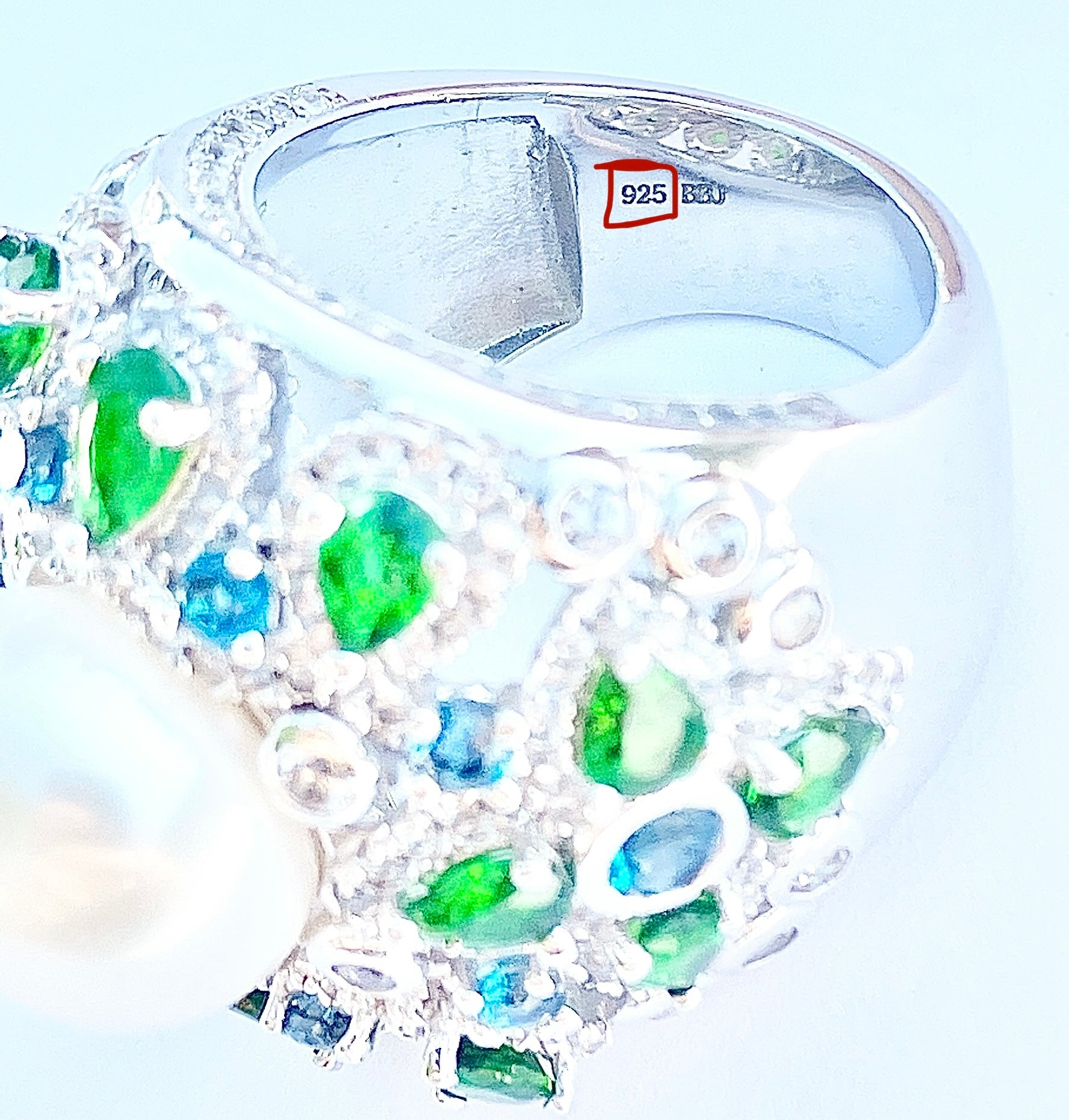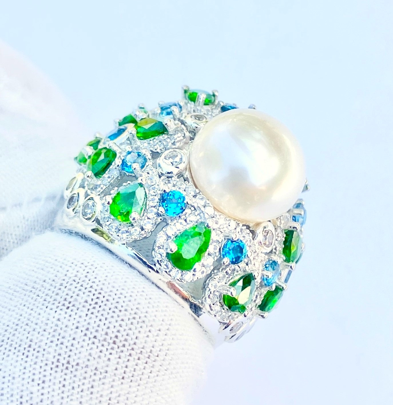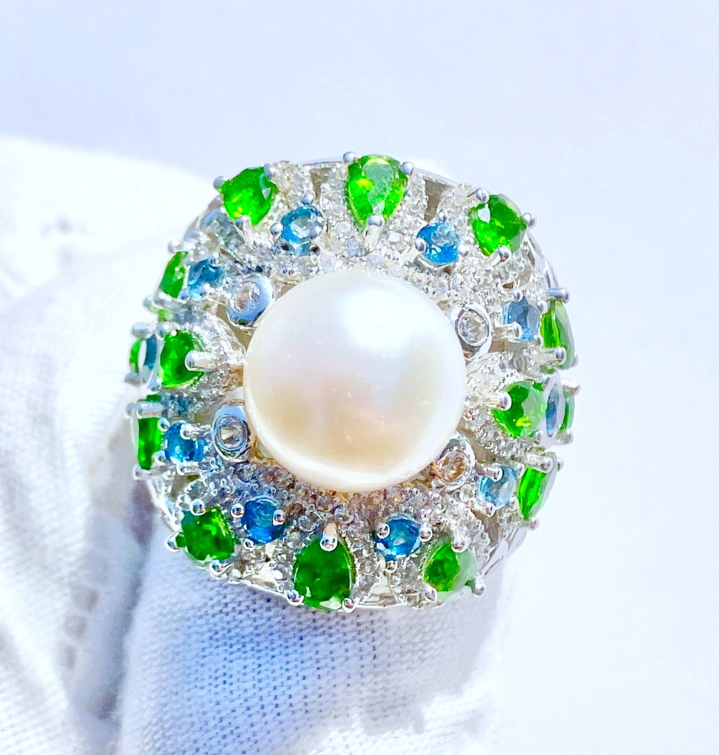 - Genuine Baby Swiss Blue Topaz, Chrome Diopside, Off-White Zircon, and Freshwater Pearl