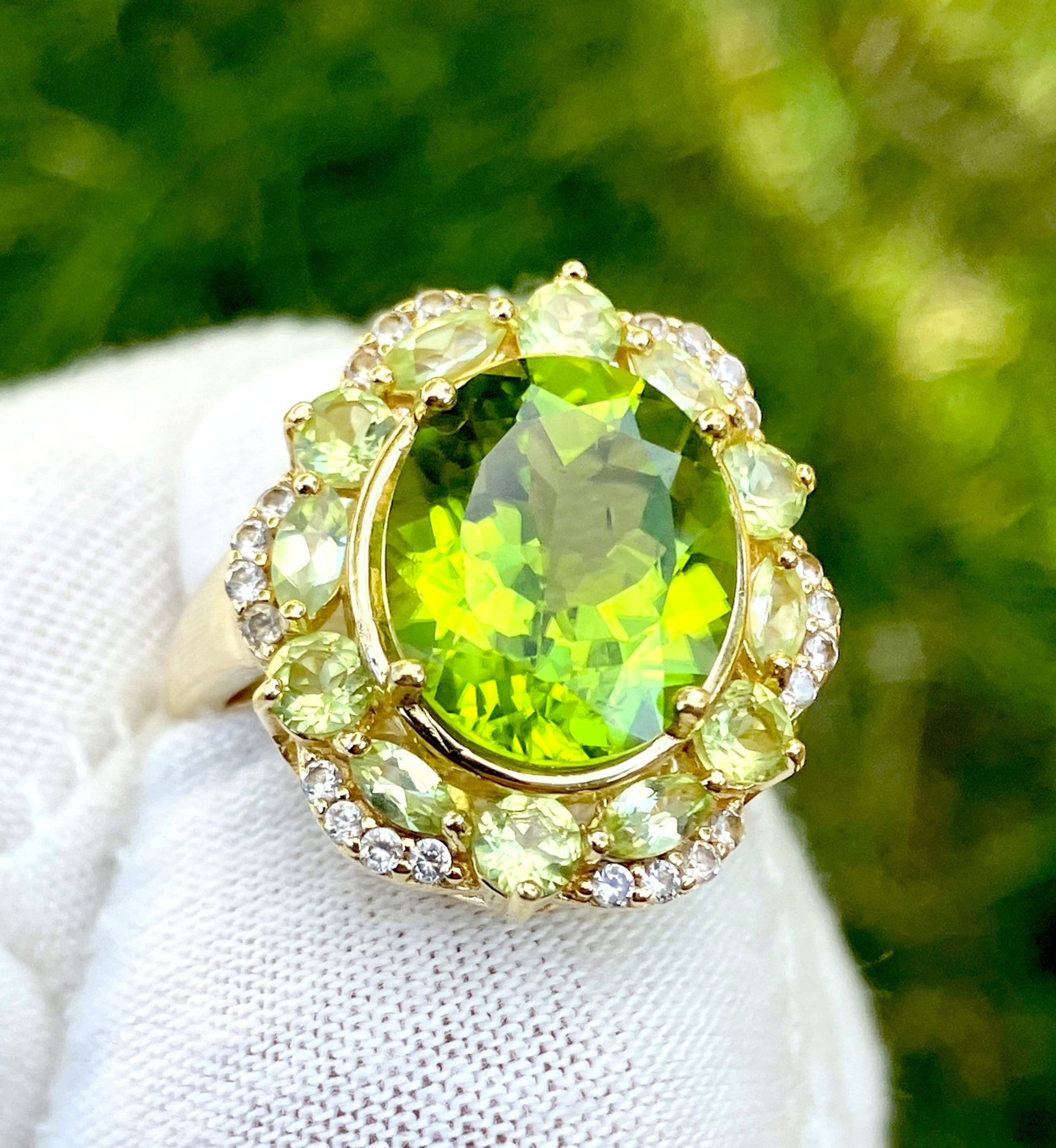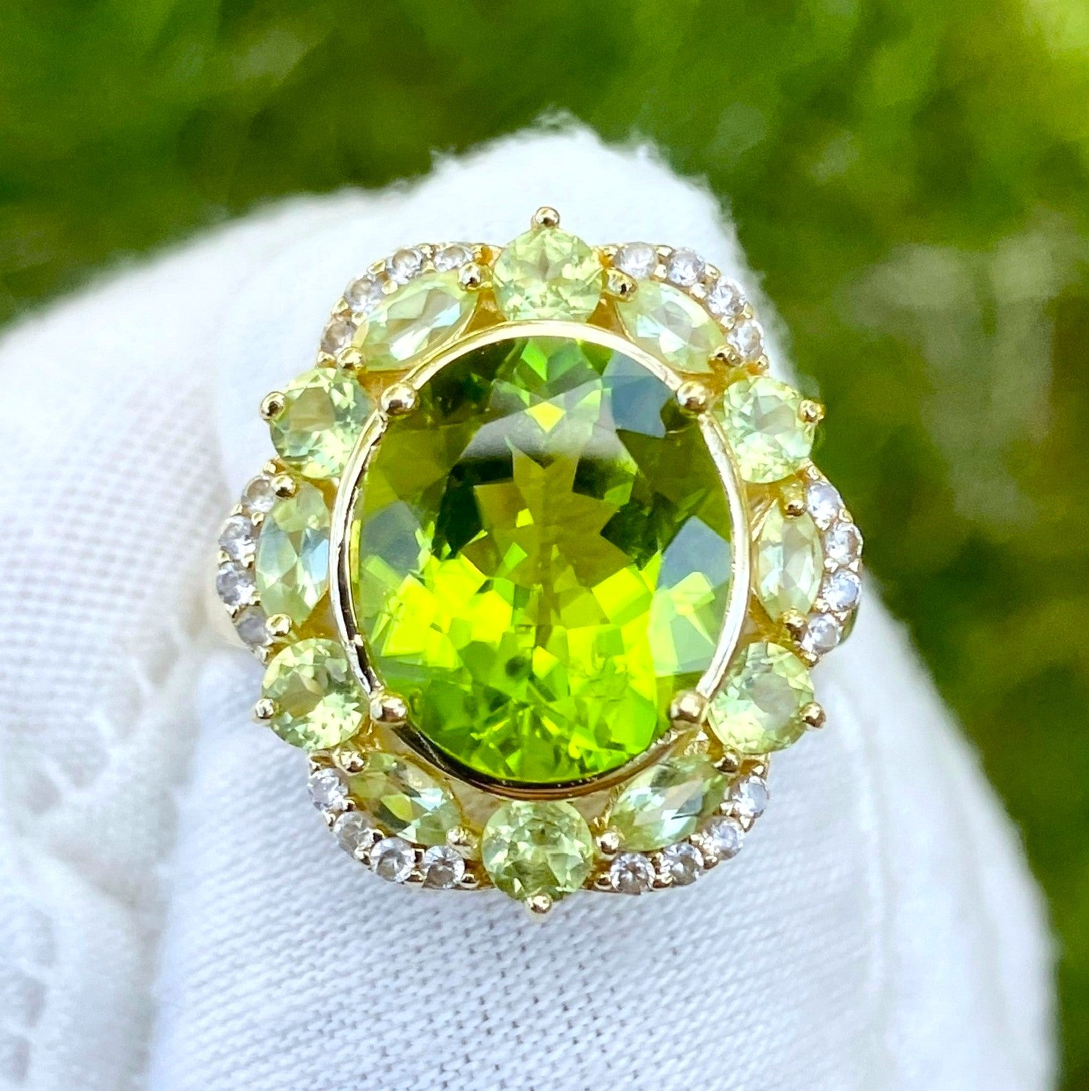 Gold Plated Oval Peridot in a Marquise and Round Cut Peridot Halo with “Diamond” Accents Ring