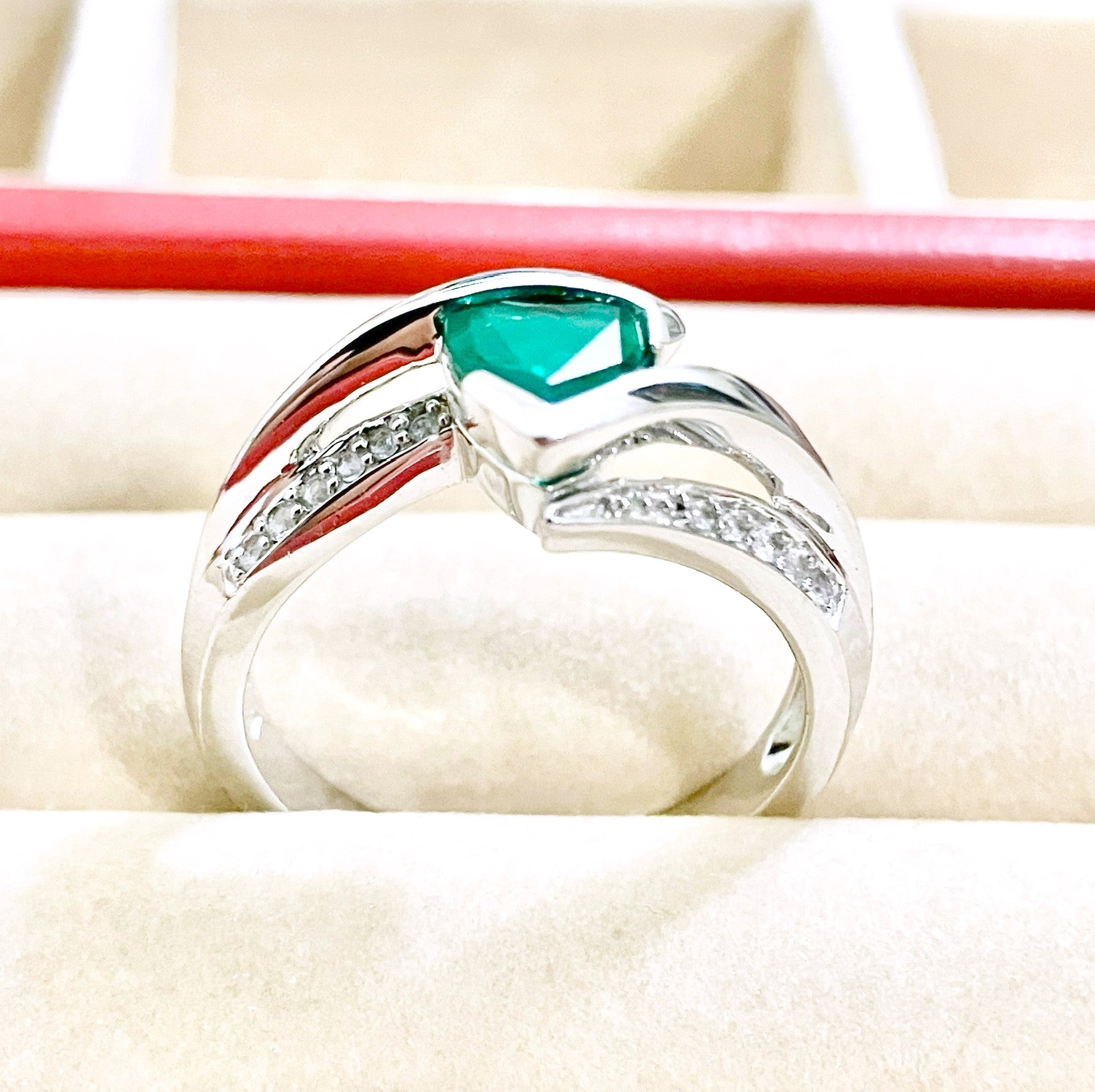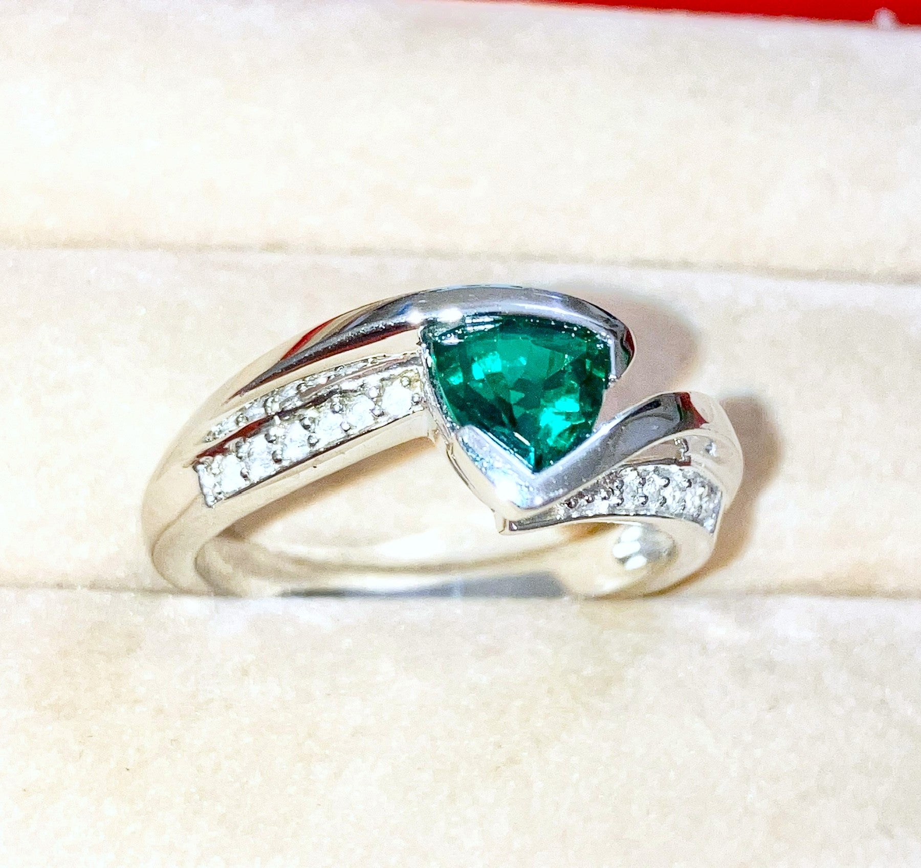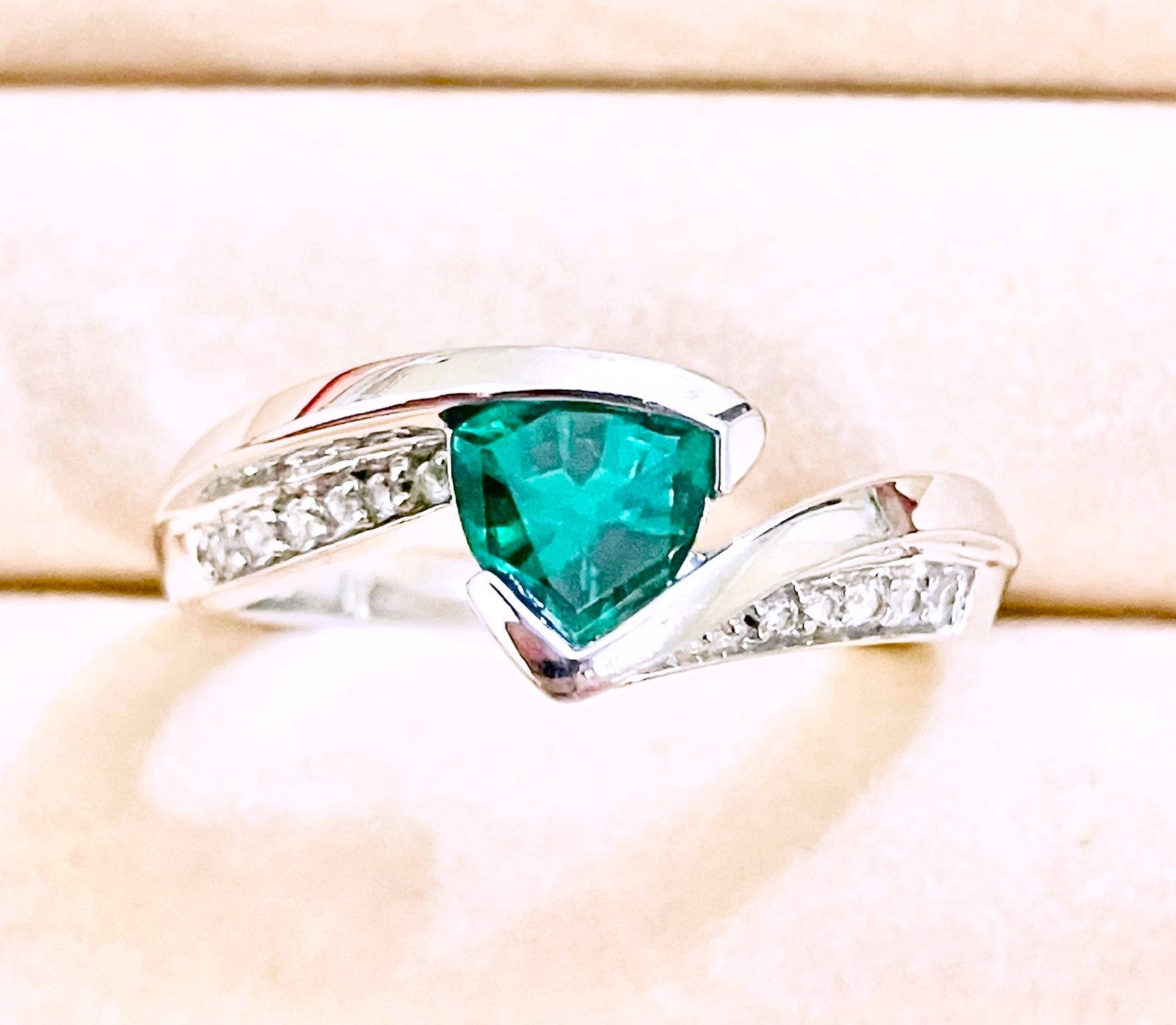 Triangular Brilliant Cut “Emerald” in Curved Bypass Shank with “Diamond” Accents Ring